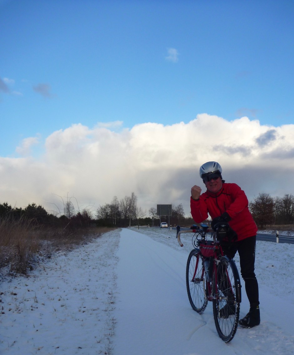 Auf den freien Flächen westlich von Werder sehen wir den ersten Schnee dieses Winters. Die Straße, die uns nach Lehnin führt, ist vereist und fordert unsere Fahrkünste. Wie gut, dass ich am Vorabend noch die Schwalbe CX mit Stollen aufgezogen habe. Immer schön locker geradeaus rollen, Hände weg vom Bremshebel.