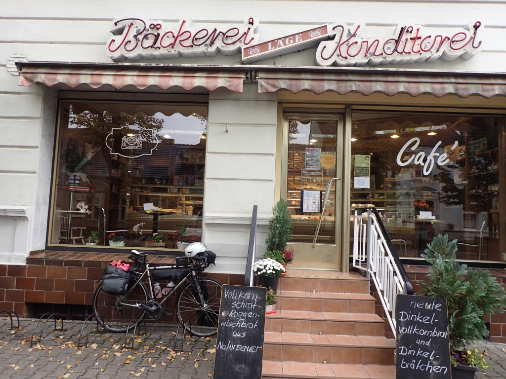 Der Wald duftet herbstlich, nasses Moos, Pilze, Harzgeruch. Aber Waldbaden macht auch hungrig. So lege ich in Rheinsberg beim Bäcker Läge einen Stopp ein und stärke mich mit Milchkaffee und Apfelkuchen.