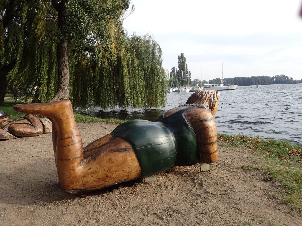 Ein paar Meter weiter stehe ich an der Hafenmole vom Stadthafen Röbel. Am Müritzstrand liegt Kunst in Form von zwei Holzfiguren, die genießend auf das Wasser schauen.