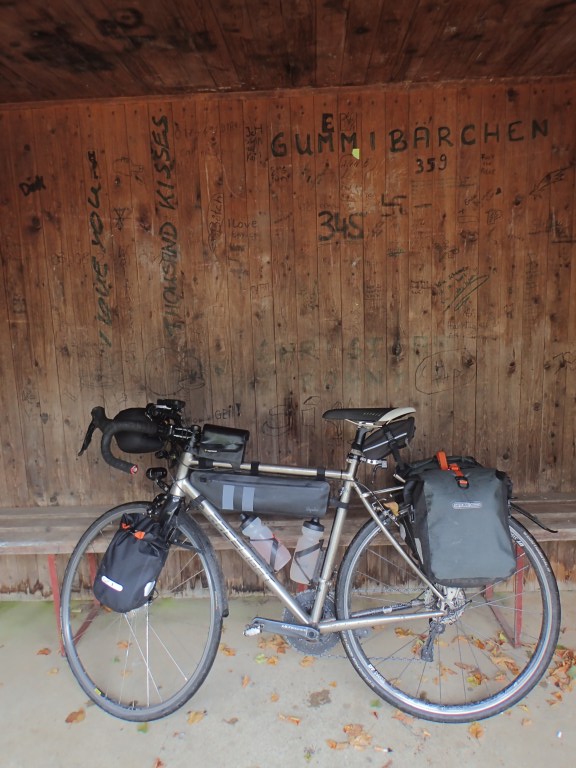 Um 9.30 Uhr stehe ich im Radschuppen des Hotels – mein Granfondo hat die Nacht gut überstanden und wartet samt allen Anbauten fröhlich auf den Start.