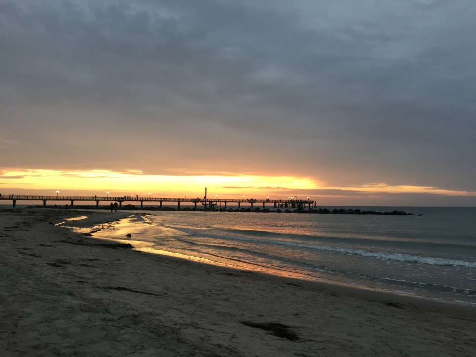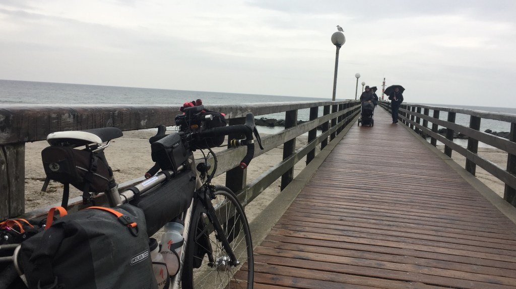 Wenige Minuten später stehe ich an der Seebrücke und schiebe mein Granfondo zwischen den Restaurants „Moby Dick“ und „Swantewitt“ hindurch. Wie oft habe ich hier schon gestanden.