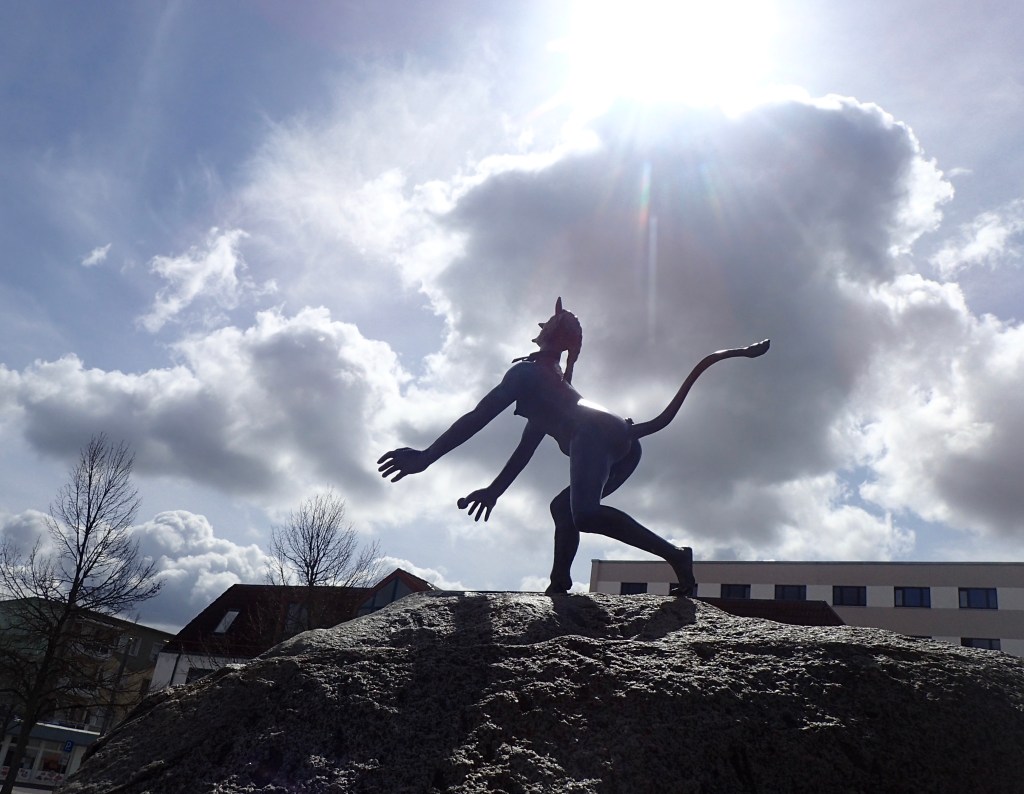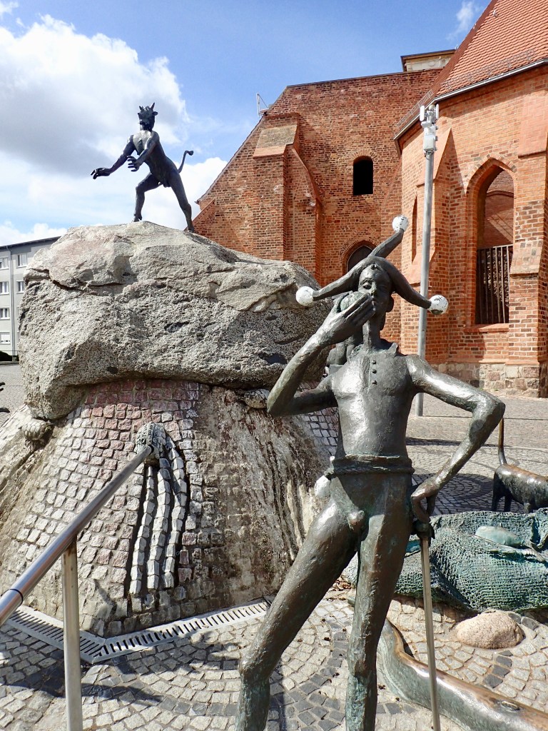 Endlich, nach der Durchfahrt von Schulzendorf kann ich mich ins tief gelegene Oderbruch stürzen, nach Wriezen mit seiner wechselvollen Geschichte. Der Dönerladen, der uns beim 200er Brevet 2019 als Kontroll- und Verpflegungspunkt diente, sieht traurig aus. Die Türen sind verschlossen. Ich tröste mich mit einer Portion Kultur in Form des Lebensbrunnens vor der St.-Marien-Kirche. Hier hat sich der Bildhauer Horst Engelhard Ende der 90er Jahre so richtig austoben dürfen. Fischer, Teufel, eine Nixe, ein Spielmann und dann noch der Herr mit dem Brett vor dem Kopf. Mittlerweile haben sich die Wriezener ausgesöhnt mit der progressiven Kunst. Sogar stolz sollen sie auf den Brunnen sein.
