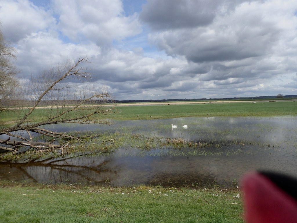 Bei Hohensaaten, wo die Alte Oder von Westen her einmündet, biegt der Flusslauf wieder ab nach Norden. Das untere Odertal beginnt, das Oderbruch liegt hinter mir. Der Radweg führt über den Deich zwischen der Oder und der Hohensaaten-Friedrichsthaler Wasserstraße. Links Wasser und rechts Wasser. Dazwischen endlose Wiesen, die teilweise noch überflutet sind. Einzelne Schwäne haben es sich gemütlich gemacht. Dicke Graugänse watscheln durch das Grün.