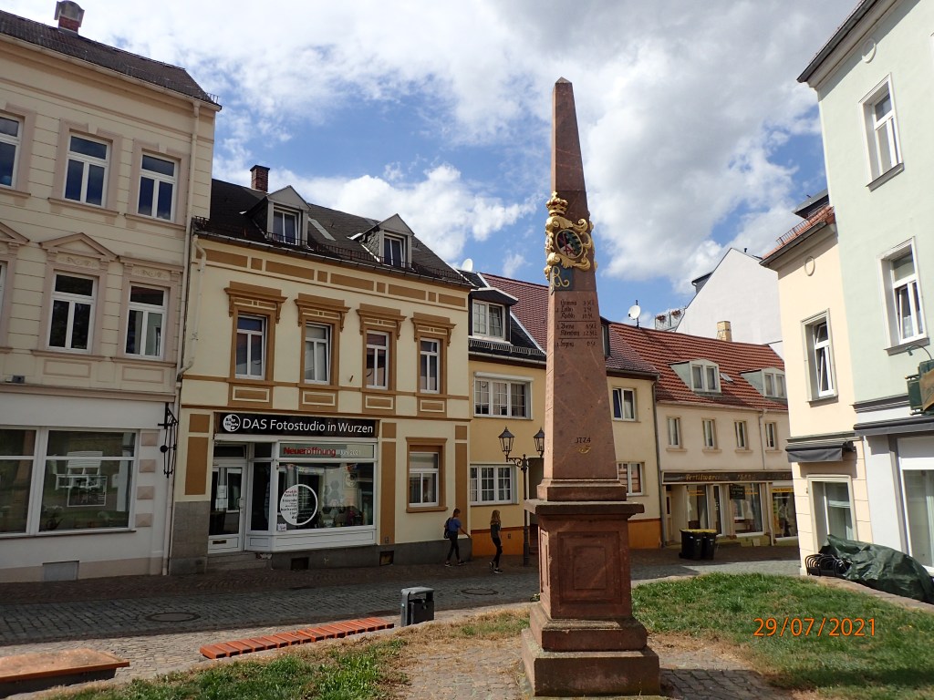 Ich quere Leipzigs Zentrum, bewundere das Stadion der Roten Bullen und die Renaissance Bauten, und schon bin ich wieder auf dem Lande. In Bennewitz an der Mulde entdecke ich das Sportlerheim, von dem aus ich zu meinem ersten 200er Brevet im Jahre 2009 gestartet war. Lang, lang ist’s her. Vor mir auf Kurs ist Wurzen schon weit vor Erreichen der Stadtgrenzen an den beiden monumentalen Türmen der ehemaligen Getreidemühle zu erkennen. Aus der Nähe betrachtet sehen sie nicht mehr attraktiv aus, ich mache lieber ein Foto vom Wegweiser aus 1774 am Marktplatz.