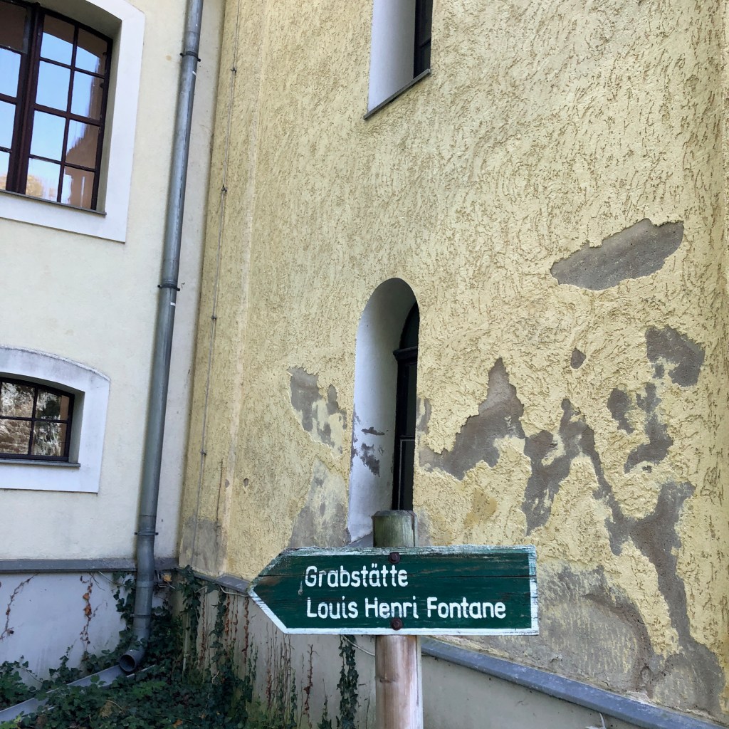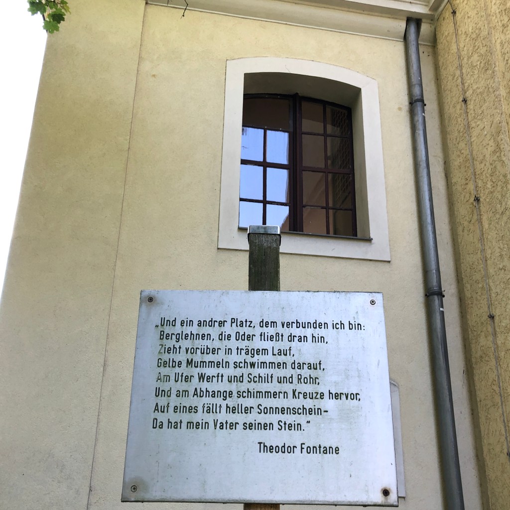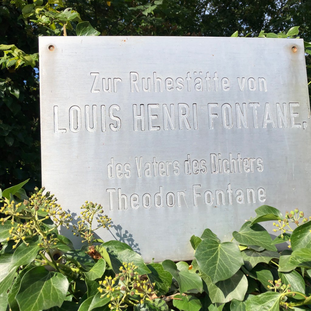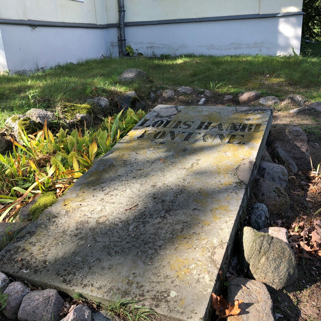 LOUIS HANRI FONTANE, kann ich lesen. Kein Geburts-und Sterbejahr, nur eben Louis HANRI Fontane. Hat er denn Hanri mit Vornamen geheißen? Nein, hat er nicht. In allen Dokumenten, die ich finden kann, wird der Fontane-Vater nur Henri genannt und geschrieben. Berichte von Veranstaltungen zum Todestag von Louis Henri F. habe ich gefunden und gelesen. Keinem der Schreiber oder Redner ist sie aufgefallen oder gar sauer aufgestoßen, die falsche Schreibweise. Also finde ich meine eigene Erklärung für den bösen Lapsus. Der Steinmetz wird betrunken gewesen sein, als er den Namen in Stein meißelte. Und eine „Korrekturplatte“ wird zu teuer gewesen sein. So mutierte Henri auf dem Grabstein zu Hanri , rede ich mir ein. Schluss mit der Krittelei, sage ich mir und richte den Blick ins schöne Oderbruch. Und der Blick von diesem Friedhof hin nach Osten ist wirklich grandios.