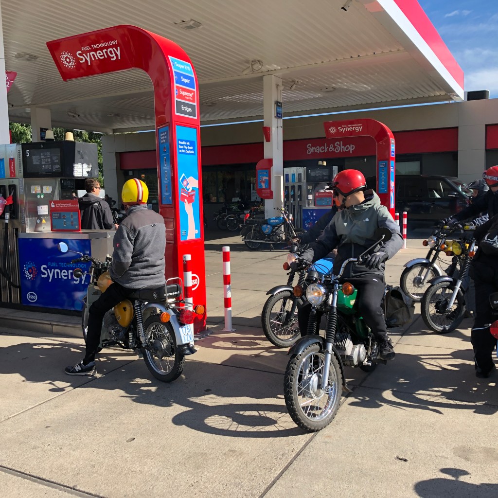 An der Esso-Tankstelle am Ortsausgang herrscht buntes Treiben: Die Fans nostalgischer Mopeds mit Namen Schwalbe und Simson haben sich hier versammelt und blockieren den gesamten Betrieb. Aber sicher nicht böswillig. Die Stimmung ist ausgelassen. Ich schaue mir einige der Zweitakt-Oldtimer an und erfahre, dass die Simson neben mir aus dem Jahr 1988 stammt. Ich nehme ein paar tiefe Züge vom verbrannten Zweitaktgemisch und rette mich wieder auf die Bundesstraße in Richtung Schiffmühle.