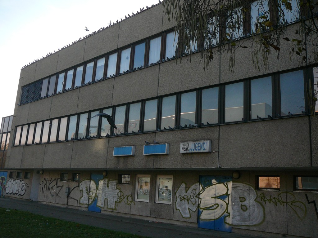 Daneben residiert in einem waschbetonverkleideten, angegammelten Bau das Zukunftswerk Jugend. Auch eine „Tiertafel“ gibt es hier. Auf den Fenstersimsen und auf der Dachkante vergnügen sich Hunderte von Tauben. Offensichtlich Stammgäste, wie an den Hinterlassenschaften am Boden zu erkennen ist. Hier und drumherum soll ein neues „Urbanes Zentrum“ entstehen. Eine Ausschreibung zum Projekt gibt es schon. Ideen werden gesammelt, Arbeitskreise gebildet. Wenn es also in der berlintypischen Geschwindigkeit vorwärtsgeht, können sich die Bewohner in der nächsten Generation über eine echte Mitte freuen. Schaun mer mal.