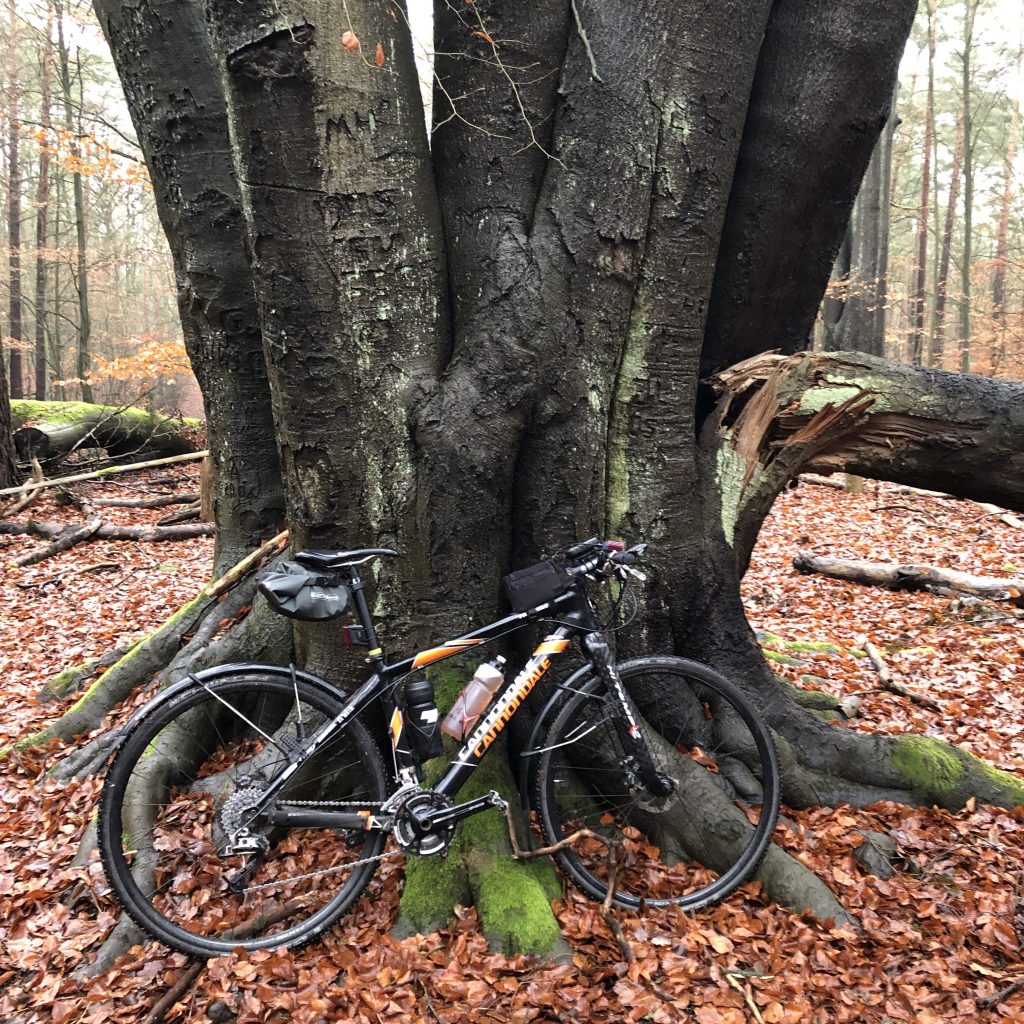 Mein bewährtes Carbon-Taurine ist ein treffliches Gravel-Gerät. Vor 14 Jahren als eins der ersten Mountainbikes mit Carbon-Rahmen gekauft, nach fünf Jahren Frust mit der Cannondale Fatty umgerüstet auf Carbon-Starrgabel von Hitemp, dann die 26er Laufräder gegen 28″er getauscht. Jetzt kann das Wundertier mit seinen 9,2 kg ohne Schutzbleche und Anbauten locker neben den aktuellen Gravel-Bikes bestehen. Vornehmlich in Herbst und Winter kurble ich damit durch Wald und Feld.