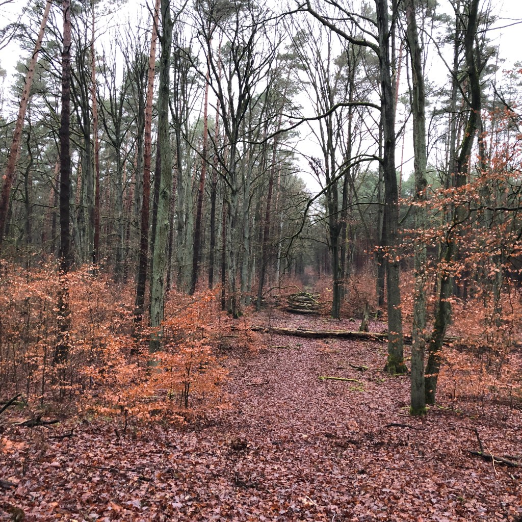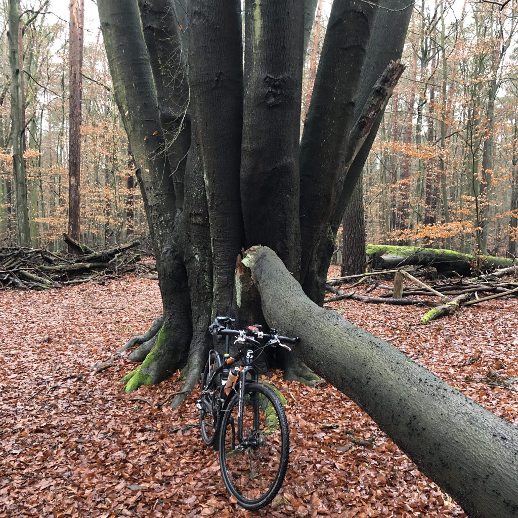 Der Radweg führt mich hin nach Wansdorf und zu einem Rastplatz, von dem aus ich mit Peter in den letzten Jahren -zig Touren durch das Havelland gemacht habe. Ich sollte mich also recht gut auskennen hier. Vor den Wander-Hinweistafeln unter den alten Eichen treffe ich einen Radler, den es, wie auch mich, an diesem grauen Dezembertag hinaus in die Natur gezogen hat. Er blättert in einem Reiseführer. Neugierig frage ich ihn, woher er kommt, wohin er noch will. Er will sich Wansdorf genauer anschauen. Kein aufwendiges Unterfangen bei diesem Ort mit wenigen hundert Einwohnern, einer kleinen Kirche und einem leicht angegammelten Gutshaus. Als ich ihm von meiner Leidenschaft für alte Bäume und meine Freude am Entdecken derselben erzähle, zeigt er mir in seinem Büchlein die „Zwölf-Brüder-Buche“, die dort als Attraktion angepriesen wird. Zwei Kilometer nördlich von hier, im Krämer-Forst, soll die Sehenswürdigkeit zu finden sein. Nein, er war auch noch nicht dort, sagt er. Aber für mich wäre das doch sicher ein schönes Ziel … Meine Neugier ist geweckt, und ich suche einen Weg hinein in das sich weit nach Nordwesten hin erstreckende Waldgebiet. Hinweise auf die Baumschönheit sehe ich nirgendwo, aber die Richtung sollte stimmen. Nach zwei Kilometern wird der gepflasterte Weg zum echten Waldweg. An einer Gabelung treffe ich auf ein Wandererpaar, das von einem großen Jagdhund begleitet wird. „Ja, dieser Weg führt zur Zwölf-Brüder-Buche.“ Ein kleiner Wegweiser würde den richtigen Abzweig weisen. Nur noch ein Kilometer. Allein, der Wegweiser kommt nicht. Oder ich habe ihn übersehen. Stattdessen wird der Weg rumpeliger, fast unfahrbar. Ich bleibe stehen und schaue endlich mal genau in meine OSM-MTB-Karte im Garmin. Ja, die Buche ist dort eingezeichnet. Also hin per Luftliniennavigation. Eine Viertelstunde später erblicke ich das angepriesene Gewächs. Eine vielstämmige Buche, die ihre Fühler weit nach oben streckt. Wirklich alt ist sie offensichtlich nicht. Das Besondere ist ihre Form mit ursprünglich zwölf Stämmen, die ganz eng beieinander eine Wuchsgemeinschaft gebildet haben. Auf nur ca. 100 Jahre schätze ich diesen Baum, gemessen an den geringen Stammdurchmessern.