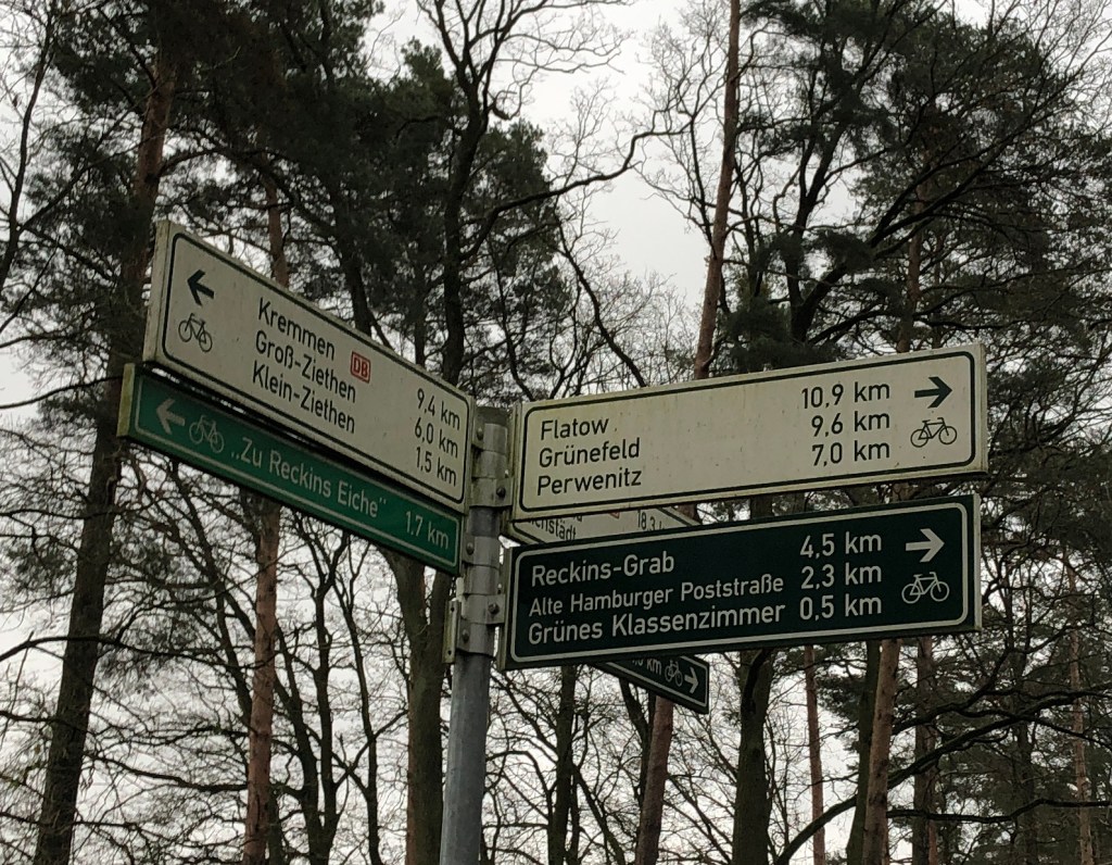 Der Hinweis auf Reckins Eiche verweist nicht auf einen prächtigen Baum, wie man meinen könnte. Nein, in 1,7 km Entfernung finde ich in Klein-Ziethen den schon seit 2019 angegebenen Landgasthof „Zur Eiche“. Hier im Ländchen Glien scheinen Schildbürger ihr Unwesen zu treiben. Jedenfalls vertraue ich ab jetzt den Hinweisen nur, wenn ich sie selbst geprüft habe.