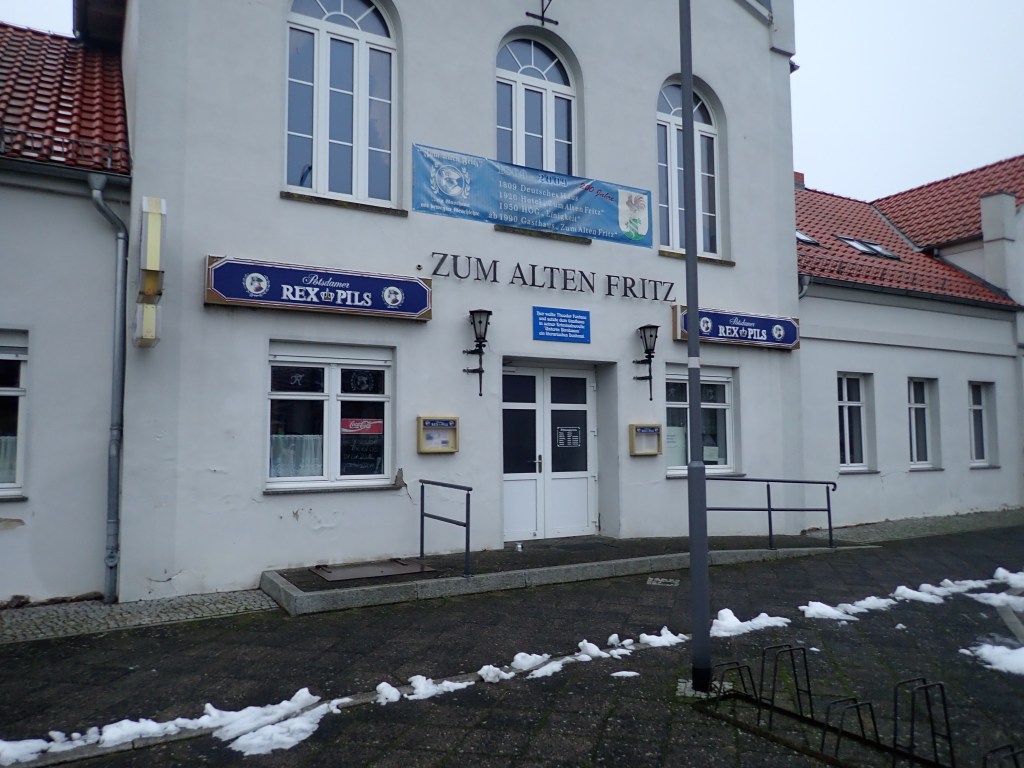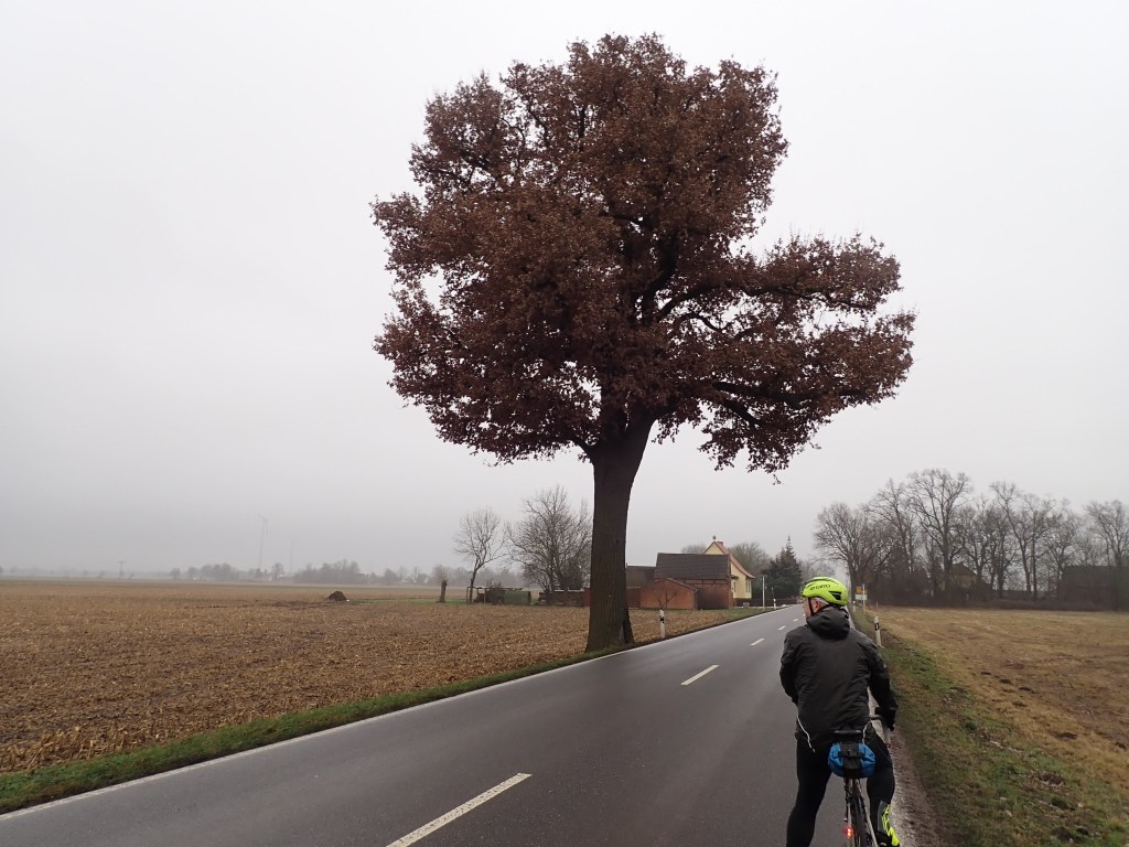 Eine Traubeneiche, zu Recht auch „Wintereiche“ genannt, beeindruckt uns mit ihrer üppigen, braunen Winterbelaubung. Langsam kommen wir der Oder näher, aber eben nicht ganz an sie heran. Heute bleiben wir auf Abstand zum Deich. Wahrscheinlich ist der Weg dort auch noch vereist, mahnt Wolfgang. Am Ortseingang von Letschin kehren wir im Netto Markt ein und gönnen uns Milchkaffee und Kuchen. Sicher ist sicher. Wer weiß, wo wir sonst noch eine Möglichkeit haben, uns zu stärken. In diesem Ort führte Fontanes Vater einige Jahre lang eine Apotheke , bis seine Spielsucht in der Pleite und dem fluchtartigen Verlassen der Gegend endete. Wir rollen durch den beschaulichen Ort und sichten am südlichen Ende das Denkmal für den Alten Fritz und gegenüber den gleichnamigen Gasthof.
