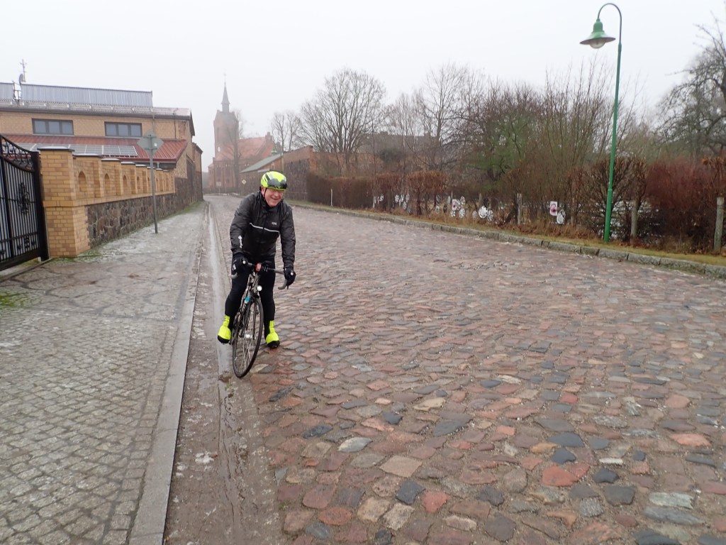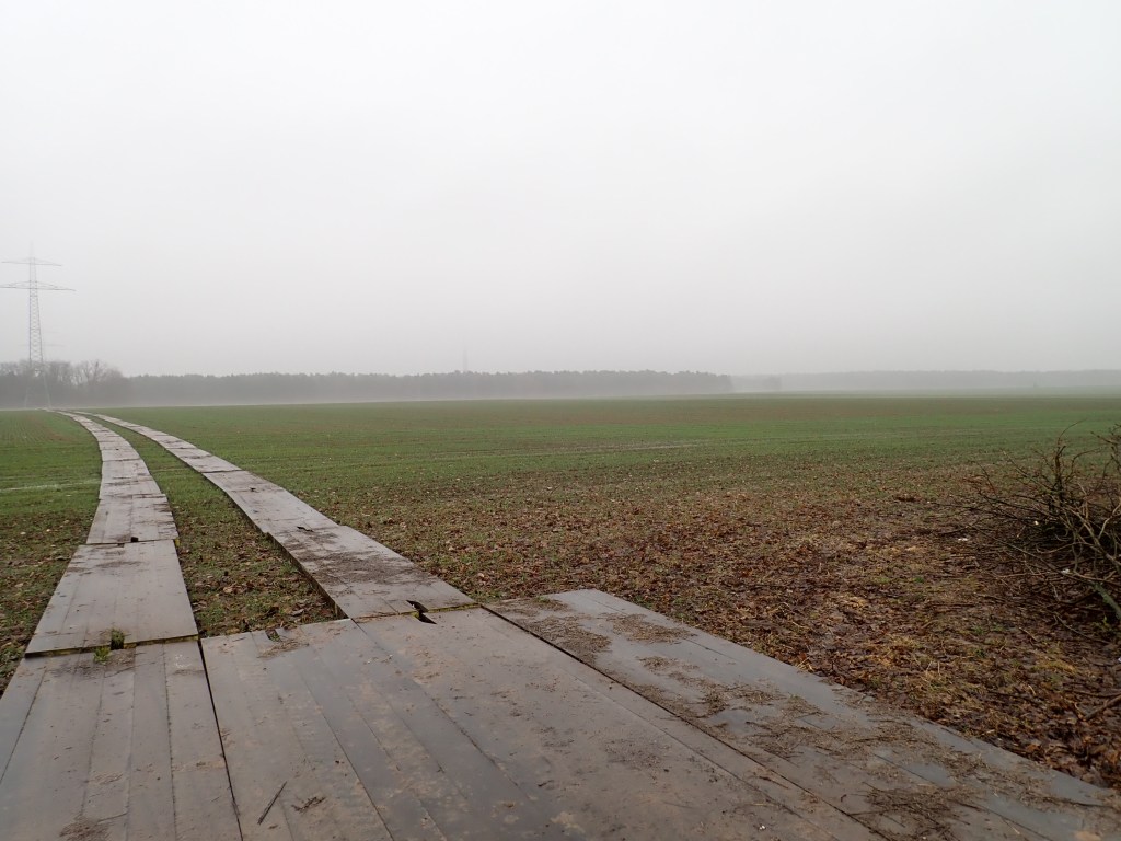 Auf dem Radweg mahnt das Resteis zum sensiblen Fahren. Wolfgang kommt von Süden heran, von Buch aus nach Hobrechtsfelde. Nach Osten rollen wir gen Bernau und dann hinein in den Barnim. Die Drehorte des Films „Unterleuten“ liegen verschlafen im nassen Nebel. Für den Bau der dringend notwendigen Stromtrassen liegen schon die Holzbohlen für die LKW auf den Feldern und glänzen nassbraun im fahlen Licht. Der Nebel ist auch nichts anderes als eine auf dem Boden liegende Wolke. Und wenn die Sonne sich zurückzieht und die Bodenkälte wirksam wird, fällt auch noch Nieselregen aus dieser Mischsuppe.