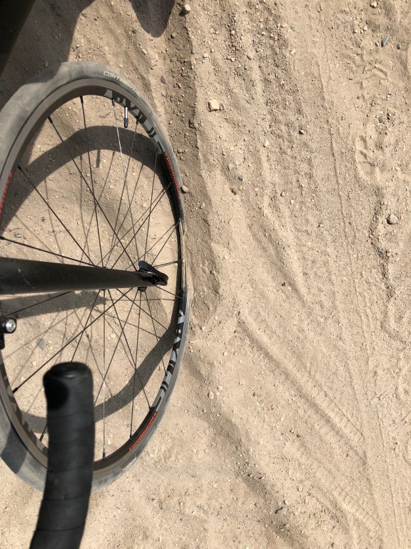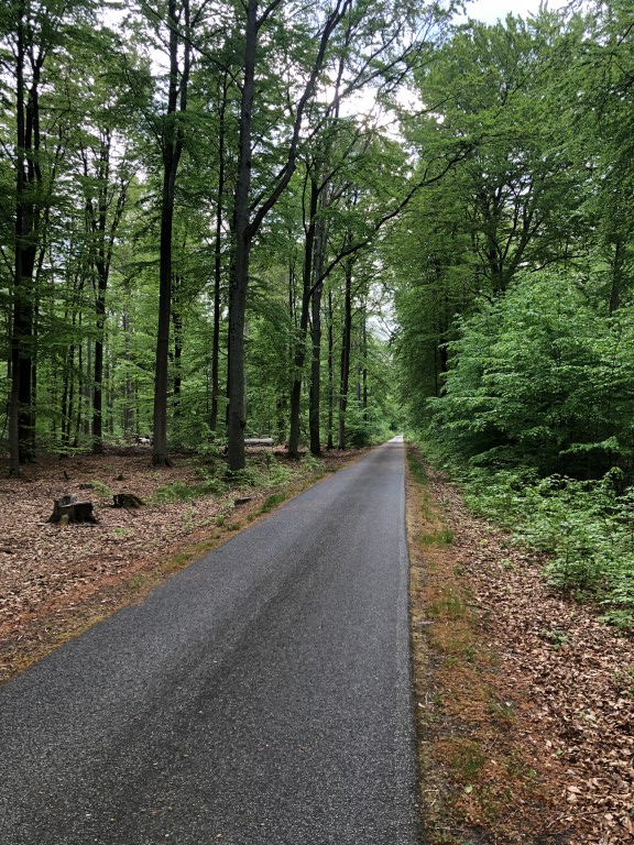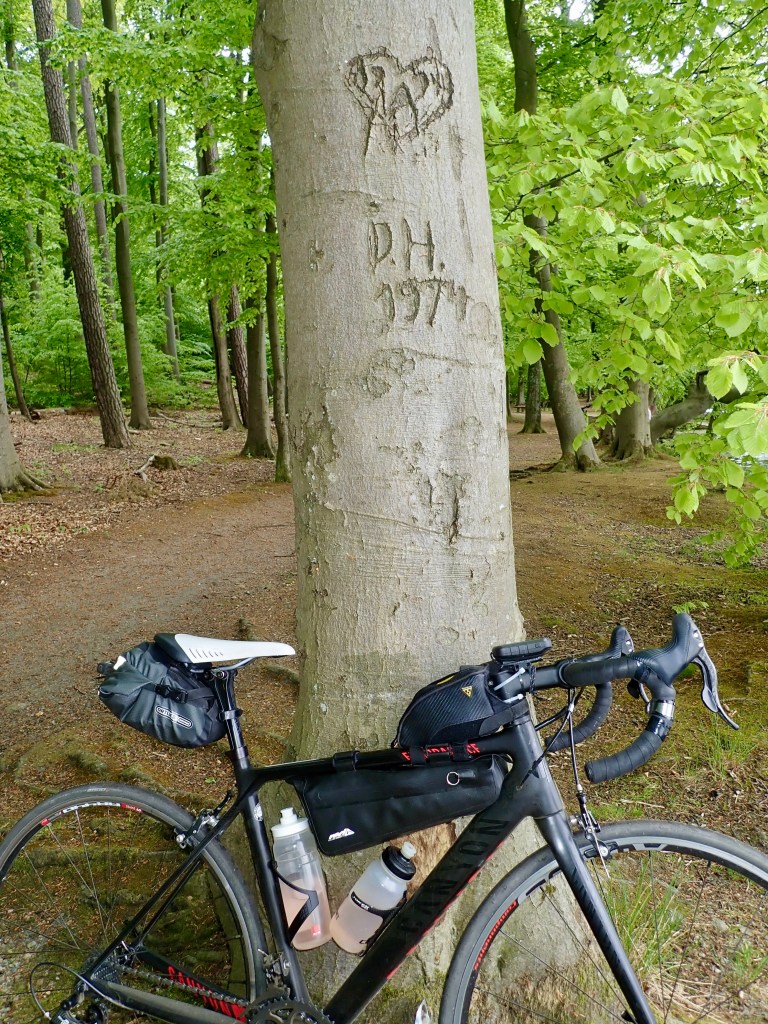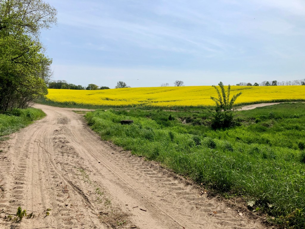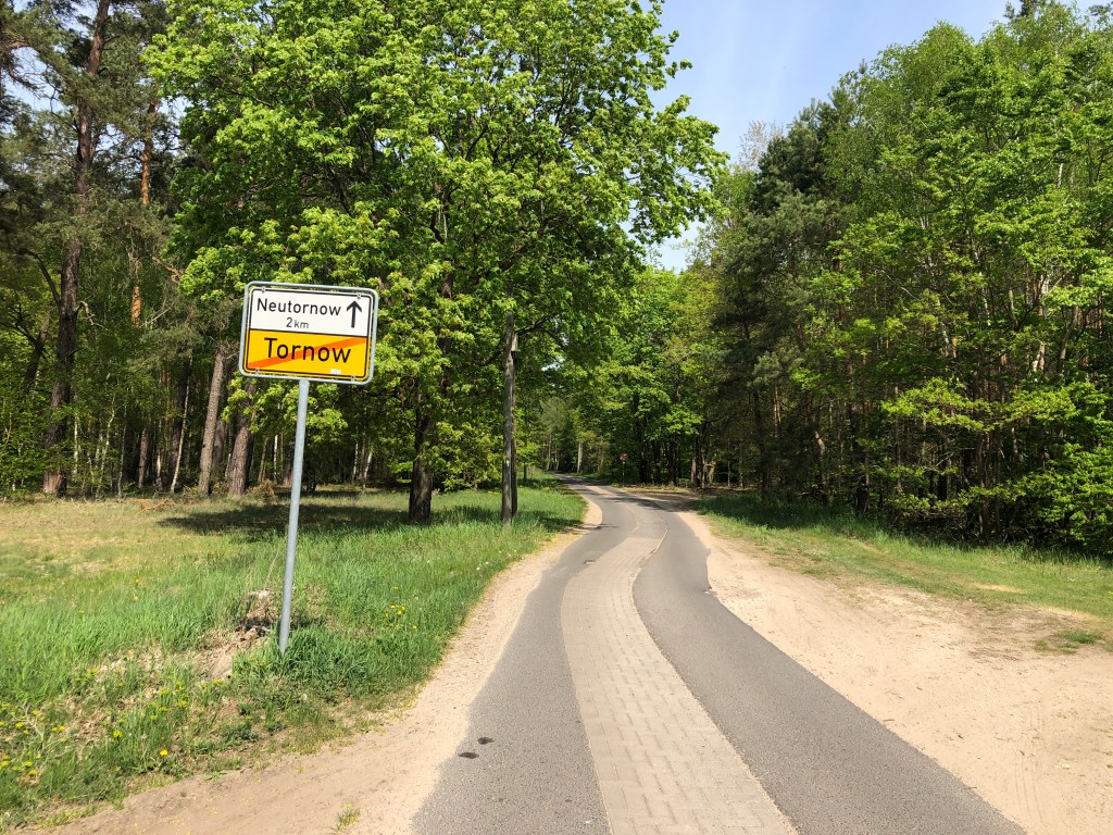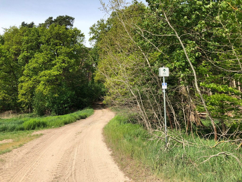 Um die Mittagszeit wirkt Barsdorf verlassen, keine Menschenstimmen, nur Vogelgesang ist zu hören. Am Ortsausgang endet die geteerte Straße und wird zum Feldweg. Beim Haussee sinken meine 25 mm Contis in den trockenen Feinsand ein. Ich steige ab und lege eine kleine Wanderpassage ein. So kann ich den Wald und die Felder intensiv genießen.
