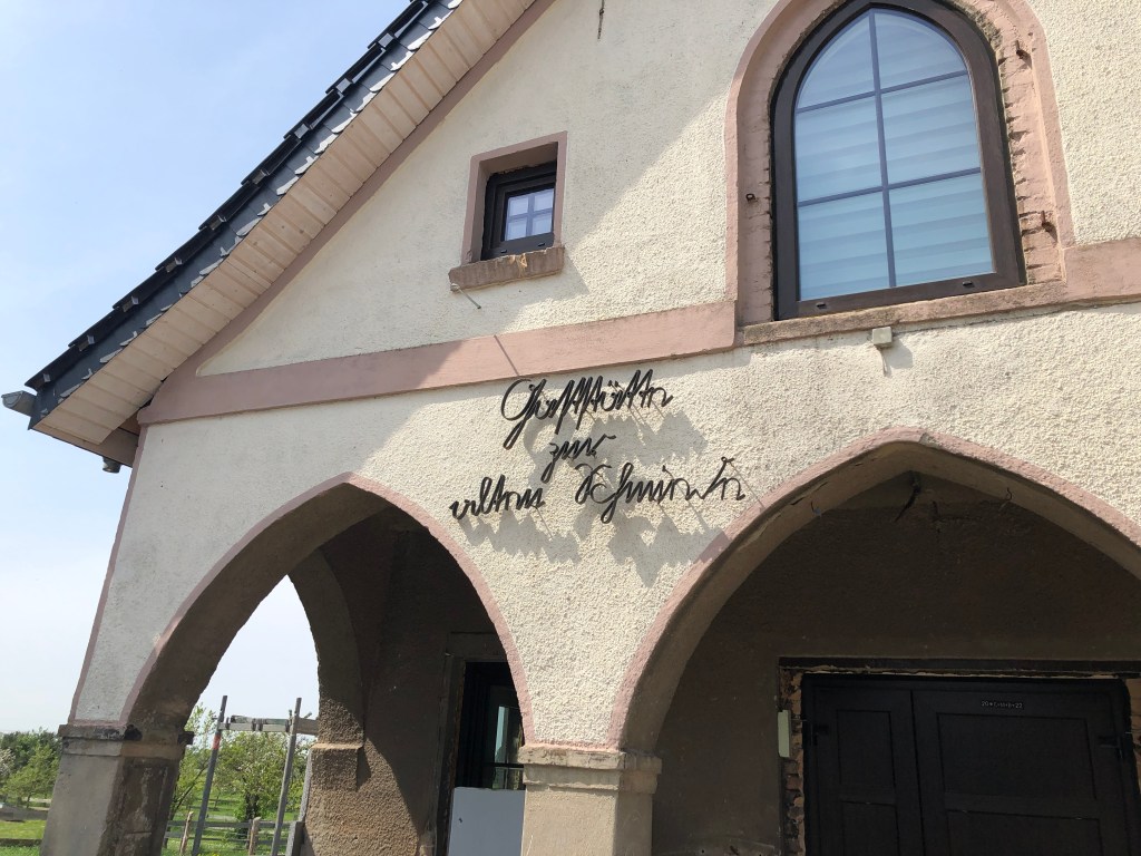 Gaststätte zur alten Schmiede, geschrieben in einer seltsamen Schrift, die an die Altdeutsche erinnert, allerdings mit einem wundersamen „e“, das aussieht wie ein „n“ .