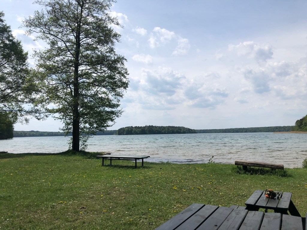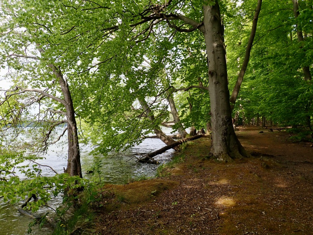 QUALzow, ein bezeichnender Name und Synonym für die kleine Qual, die der Randonneur im Sand erfährt. Vorbei am Stolpsee und Bredereiche führt die hügelige Rumpelstraße nach Fürstenberg. Schön die Landschaft, aber arg durchgerüttelt wird man. Ab Fürstenberg hin nach Neuglobsow werde ich durch den herrlichen Radweg entschädigt. Keine Autos, viel Wald und Wasser, viele kleine fiese Wellen, die Körnchen kosten und Kondition bringen. Am Stechlin rolle ich an den Strand und gönne mir am Imbiss ein Stück Schokoladenkuchen und einen großen Kaffee. Die angebotene „Pizza-Meterware“ verschmähe ich. Der Stechlin ist immer schön, und heute zeigt er wieder, was in ihm steckt. Die alten Buchen am Uferrand zaubern eine ganz besondere Stimmung.