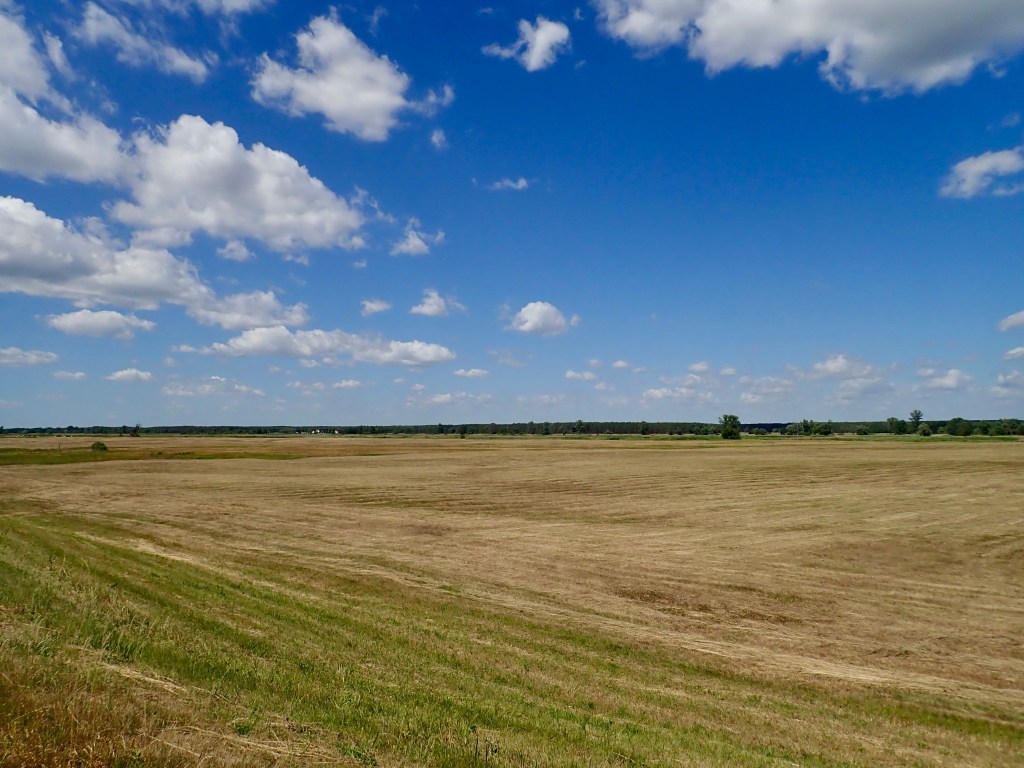 Der blaue Oderbruchhimmel ist mit Cumuluswolken betupft. Das Wasser der Oder schimmert eher blauschwarz. Die erste Heuernte ist eingefahren, braun-beige liegen die Wiesen da. Einzelne Störche staksen auf der Futtersuche bedächtig umher. Rinderherden weiden diesseits und jenseits der Ufer. Wie schön, dass lange nicht alle dieser wunderbaren Tiere in riesigen Milchviehanlagen ihr trauriges Leben fristen müssen.