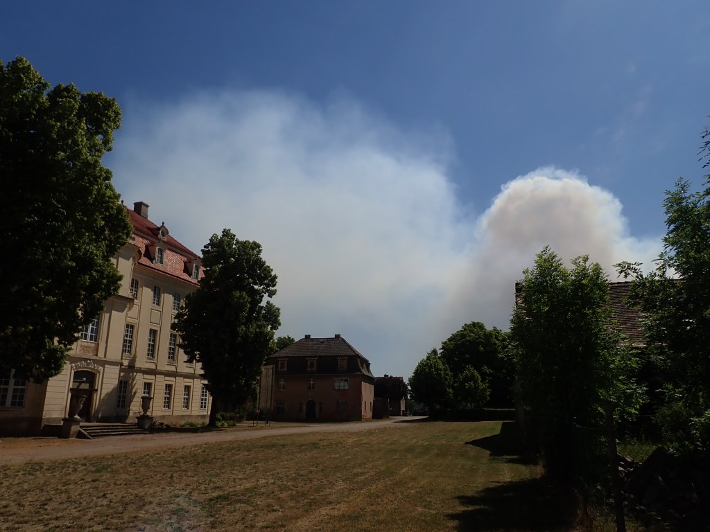 Die neuesten Nachrichten berichten über einen gewaltigen Brandherd in der Gohrischheide. Bei Falkenberg/Elster sieht es bei der kleinen Schloßanlage Martinskirchen fast so aus, als ob das Feuer im nahgelegenen Wald loderte . Bedrohlich wirkt die Szenerie.