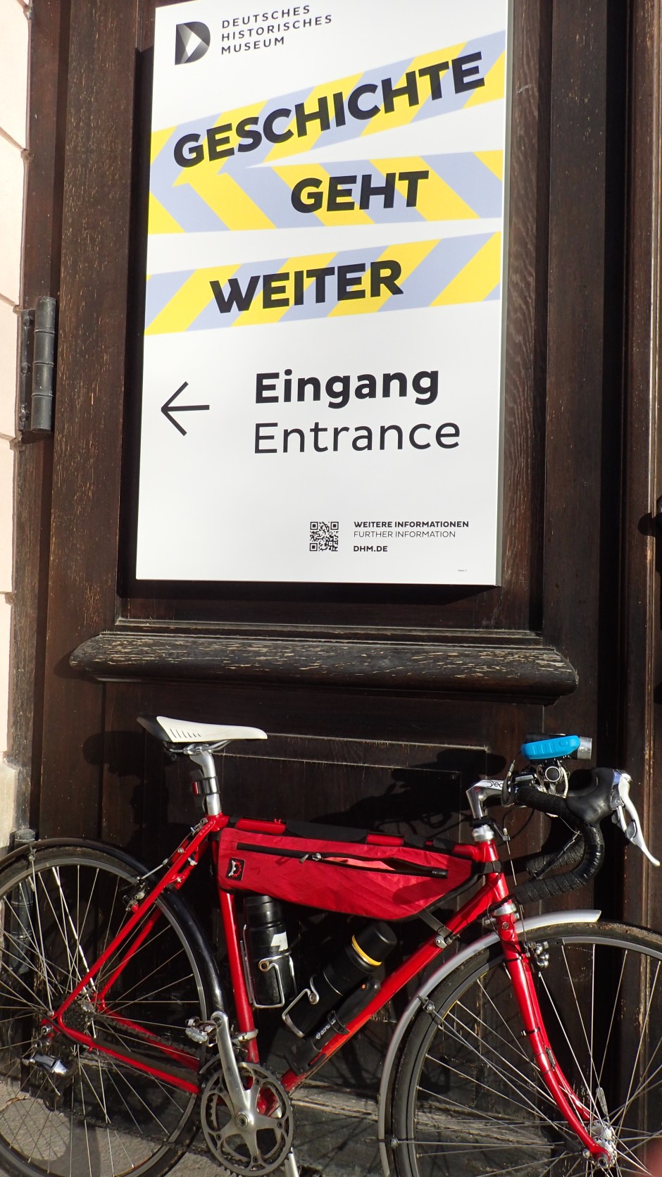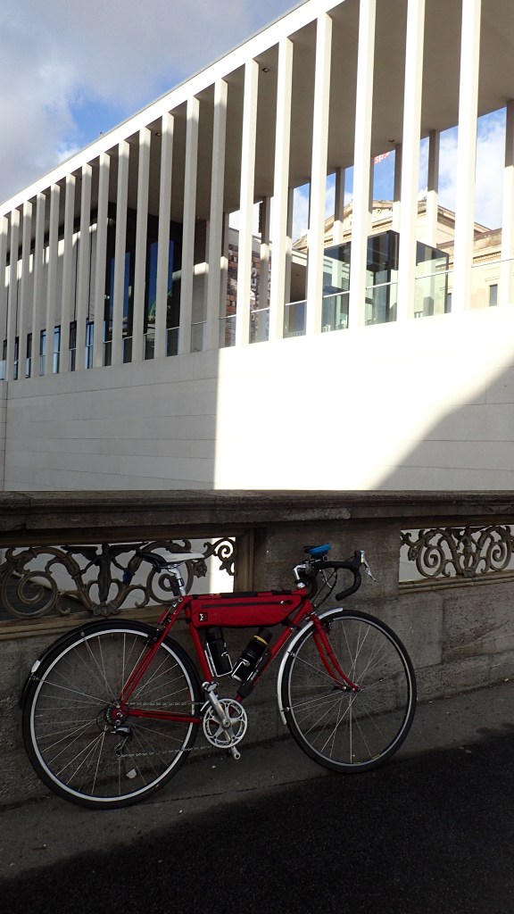 Langsam aber stetig arbeite ich mich von Osten her in die Stadt hinein. Mittlerweile gibt es wesentlich mehr vernünftige Radstreifen auf den breiten Straßen als noch vor fünf Jahren. Es hat sich etwas getan. Auf dem Hackeschen Markt werden die Stühle rausgestellt. Ein Pianoplayer spielt auf der noch regennassen Friedrichsbrücke. Ich genieße die friedliche Stimmung. Dann steige ich ab und schiebe mein Basso kreuz und quer durch die Kolonnaden vor der Nationalgalerie, entdecke eine Gruppe junger Frauen, die offensichtlich – als Engel verkleidet, eine Performance proben. Fotografieren lehnen sie ab. Ich kann es verstehen. Dafür kann ich die Linse meiner Olympus Tough auf die historischen Gebäude richten. Das Licht ist herrlich, die Schattenrisse der Skulpturen wunderbar.