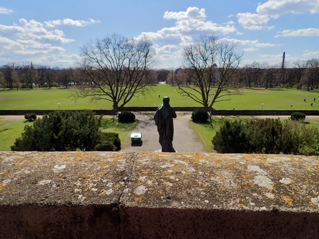 Die Story dazu würde allein locker für einen langen Beitrag ausreichen, nur treibt es mich an diesem Frühlings-Sonnentag weiter. Zunächst auf die andere Parkseite, von wo ich die gesamte Anlage samt „Bastion“ übersehen kann. Reichlich Platz zum Laufen, Spielen, Liegen… Getreu dem Motto des Architekten Bauer bei der Ausschreibung: „Freude schöner Götterfunken – zur körperlichen wie seelischen Erholung der Großstadtmenschen. Sport bei frischer Luft und im Licht der Sonne“.