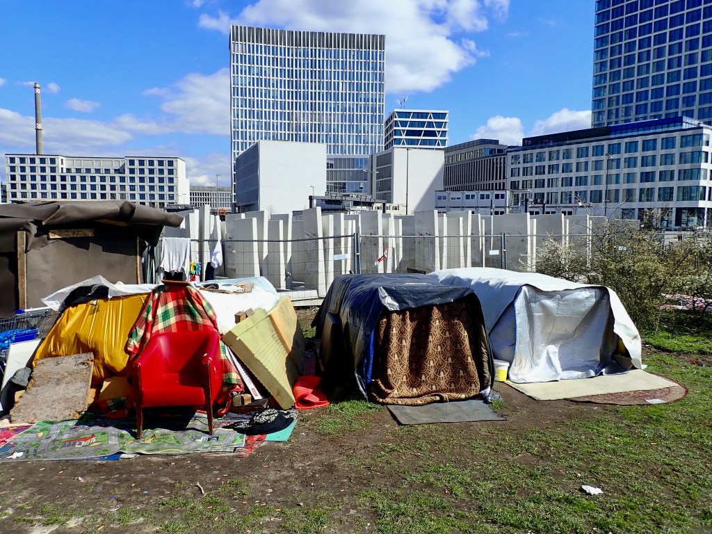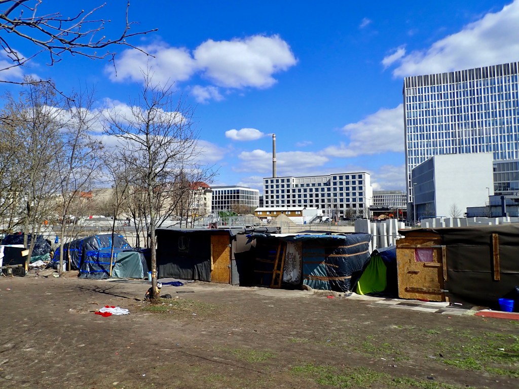 Bedrückende Realität: Obdachlosenzelte und Behausungen neben neuen Bürobauten beim Hauptbahnhof und hinter der sogenannten neu entstehenden Europacity, wo noch reichlich Wohnungen zum Kauf angeboten werden. 100 Quadratmeter für 750000 Euro. Geradezu ein Schnäppchenpreis für Mittellose.