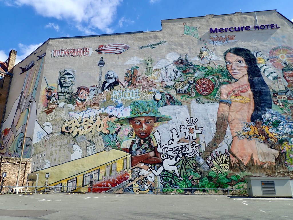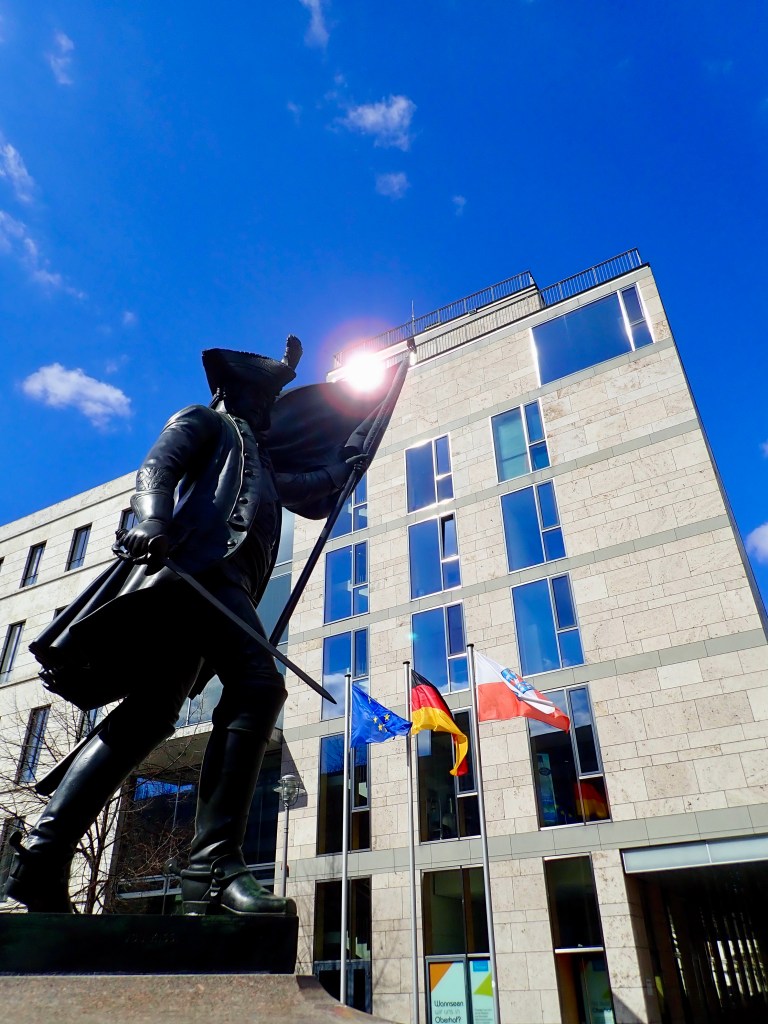 Neue Kunst, alte Kunst, Wandkunst, Skulpturen … reichlich Nahrung für alte und junge Augen und Köpfe. Man muss nur hinschauen. Friedrich der Große ließ für seine Generäle der Schlesischen Kriege Denkmäler errichten. Der Graf von Schwerin schwenkt seine Fahne dekorativ vor der Landesvertretung Thüringens am Zietenplatz. Die europäische, deutsche und die Thüringer Flagge flattern dekorativ im Gleichklang.
