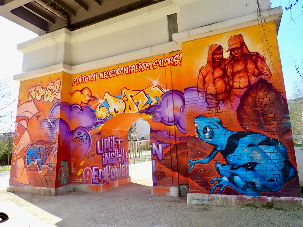 Einfach losrollen, immer der Nase nach, grobe Richtung sonnenwärts, nach Süden. So durchkurve ich das Märkische Viertel, das mittlerweile in bunten Farben leuchtet. Die Menschen scheinen gut gelaunt, kein einziger raunzt mich an, als ich lange auf den Gehwegen rolle. Total untypisch für Berlin, geradezu befremdlich. Aus der Architektur der 70er bewege ich mich hinein in die „Weiße Stadt“, einer Siedlung der klassischen Moderne, Unesco Welterbe und in den späten 20er Jahren entstanden. Irgendwie mutet die Architektur hier viel langlebiger und schöner an als die neuen Betonklötze der sogenannten Europacity auf dem Gelände des ehemaligen Lehrter Bahnhofs. Südwärts rolle ich hinein in das nächste Kulturerbe, die Schiller-Siedlung, auch Englisches Viertel genannt. Bristol- , Edinburger- und Dubliner Straße umrahmen den riesigen Schillerpark, den ich mir genauer anschauen will. Eine Parkanlage mit einer Fläche von 29 ha. Und das mitten in einer Großstadt! Mehr als 29 Fußballfelder groß.