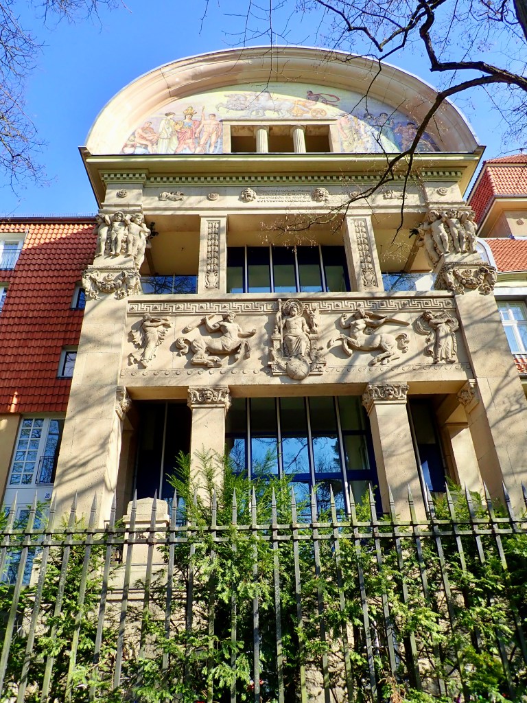 In der ehemaligen Villa Walther residiert jetzt die Botschaft des Kosovo. „Eklektizismus“ wird die Architekturrichtung genannt, bei der sich verschiedene Stile mischen, Hauptsache pompös und eindrucksvoll. Der Baurat, der sich mit der riesigen Villa finanziell in den Ruin stürzte, hat sich angeblich 1907 im Turmzimmer aus Kummer erhängt. So weit die Geschichte, auf die sicher reichlich andere in den Folgejahren folgten.