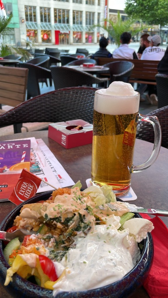 Auf der Terrasse des Cafés Extrablatt auf dem Rathausplatz lasse ich bei einem vegetarischen Teller und einem Bier die verflossenen Jahre Revue passieren. Wehmut!