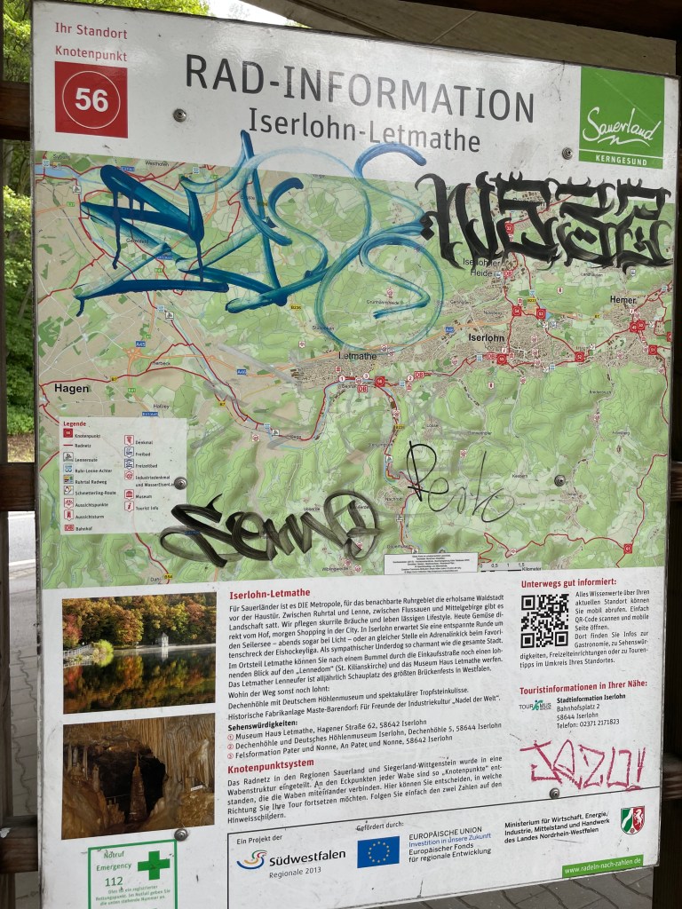 Bei Hohenlimburg staune ich beim Überqueren der Lenne über eine Kanu-Slalomstrecke, auf der drei Wasserratten trainieren. Der Lenneradweg ist nur mäßig beschildert, genauso mäßig, wie die Wegführung und die Beschaffenheit der Fahrbahn. Auf der Homepage wird auch folgerichtig Familien mit Kindern die Fahrt per Bahn von Letmathe bis Werdohl empfohlen. Kleine Abschnitte führen am Fluss entlang, meistens finde ich mich auf der B 236 wieder, wo die LKW in Kolonnen unterwegs sind. Für ungeübte Radler absolut nicht zu empfehlen! „Gegen Ende der Route geht es vermehrt durch Städte und der Radfahrer bekommt einen Eindruck vom pulsierenden Leben des Ruhrgebietes. “ So ist die Strecke auf der Internetseite https://www.radeln-nach-zahlen.de/de/outdooractive-touren/lenneroute beschrieben. Ja, stimmt! Durch die Stätten der ehemaligen Metallindustrie. Hammerwerke, Metallverarbeitung, Drahtziehereien, Schmieden. Im 19. und 20. Jhd. erblühte hier der Wohlstand. Die Industrialisierung begann. Die Menschen erlebten Aufstieg und Wohlstand. Jedenfalls relativ zur Situation davor. Das gesamte untere Lennetal ist geprägt durch diese Geschichte. Das Ende der Hoch-Zeit habe ich selber erlebt. Jahrelang konnte ich in den Semesterferien gutes Geld für harte Arbeit im Federnwerk Brüninghaus in Werdohl verdienen. 10 Tonnen Stahl habe ich damals pro 12-Stundenschicht bewegt. Ich hatte eine Garantiebeschäftigung in diesen Jahren. Mein erstes Auto habe ich so finanzieren können.