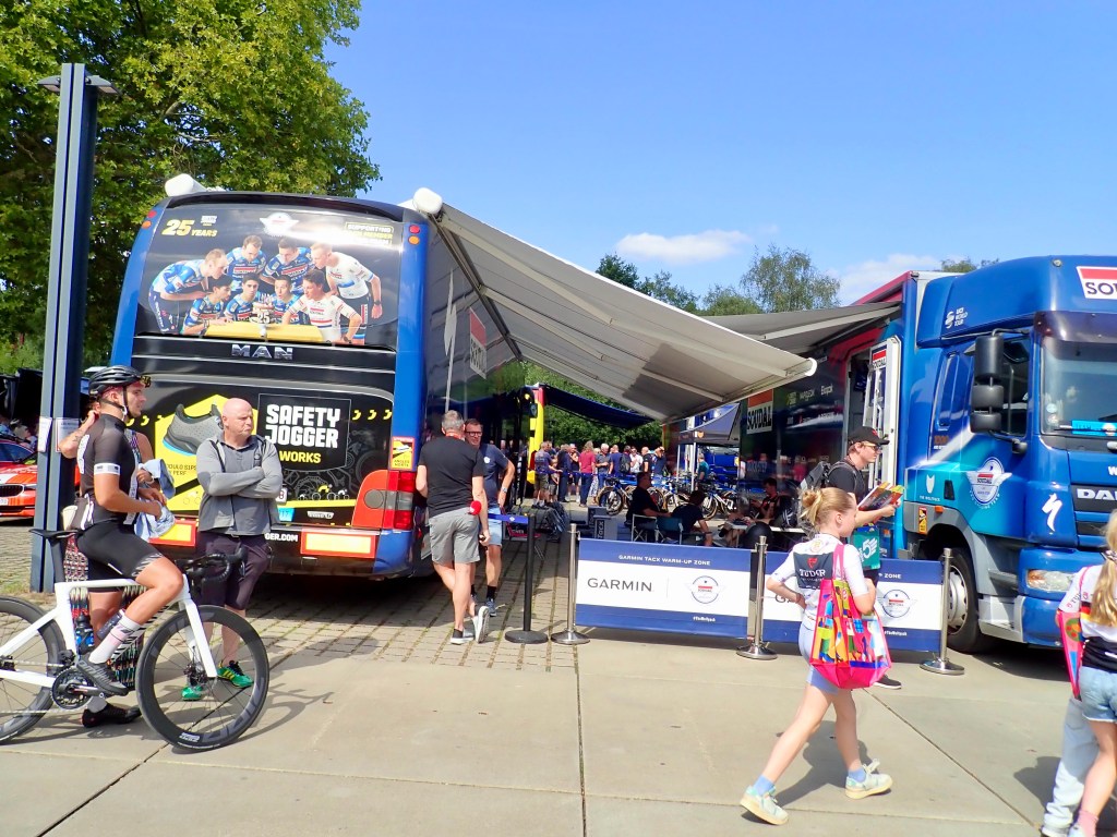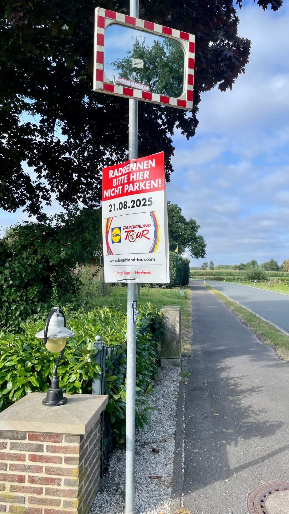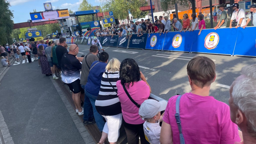 Pferde, Rinder, Wald und sattgrüne Wiesen prägen die Landschaft. Ich fahre am Schloss Cappenberg vorbei und bewundere den prachtvollen Toreingang, da lenkt mich ein besonderes Fahrzeug ab: Aus dem „Fléchage-Car“ schallt meinem deutschen Morgengruß ein frohes Bonjour entgegen. Klar, die erste Etappe der Deutschland-Tour wird vorbereitet. Professionell und aus der Hand der Tour de France Organisatoren.