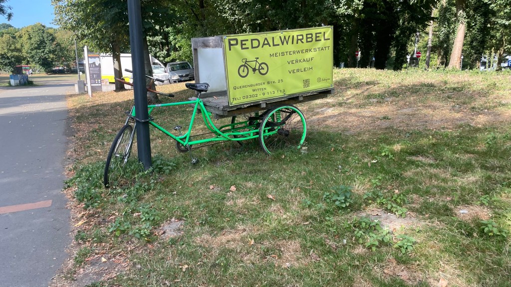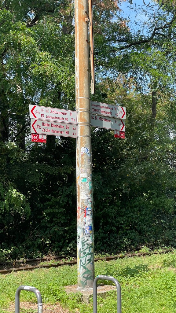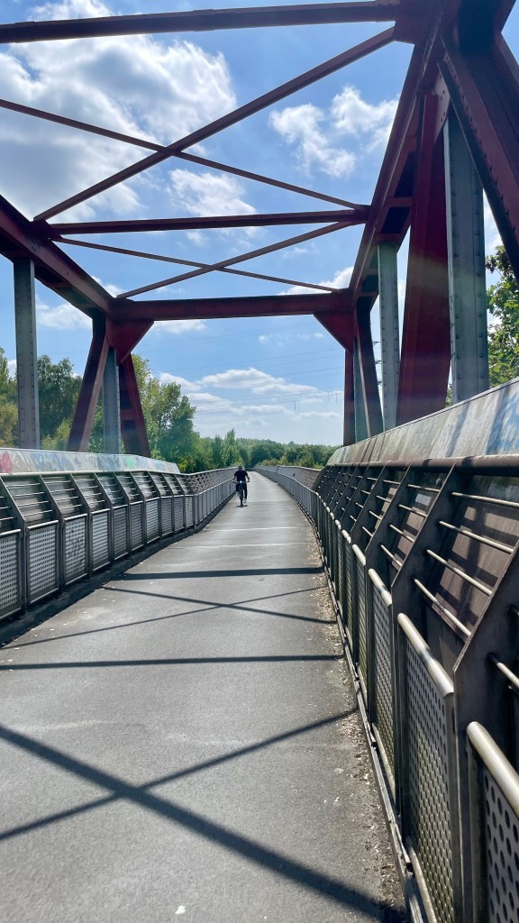 Die habe ich in allerbester Erinnerung. Einst wurden über die Erzbahntrasse die Hochöfen von Schalker und Bochumer Verein mit Eisenerz versorgt. Nach einiger Kurverei rolle ich am Bahnhof Herne, dann am Bahnhof Wanne-Eickel vorbei, und kurz darauf erklimme ich die Erzbahntrasse. Nur Radfahrer sind hier unterwegs plus einige Spaziergänger. Pure Entspannung – kein Autoverkehr.