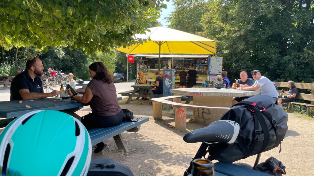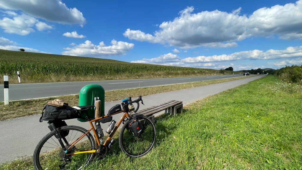 Mein Zeitfenster für eine Tour ist vier Tage. Nicht üppig für eine schöne Runde. Aber bessermachen als lassen. Außerdem muss ich mein Deutschlandticket zum Ende des Monats mal wieder testen. Am Dienstagmorgen fahren die Züge wider Erwarten pünktlich. Berlin-Stendal-Wolfsburg-Hannover-Minden. Aber genau hier verpasse ich den Anschluss nach Hamm. Was soll es, auf diese Weise kann ich testen, wie das Rad mit Gepäck rollt, und bis zum Mini-Bahnhof Porta Westfalica sind es nur rund 6 Kilometer. Es rollt! Meine Beine sind locker, die Trinkflaschen gefüllt. Also kann mich eine weitere Verspätung jetzt nicht ärgern. Der RE6 rollt pünktlich ein. Zwar habe ich nur einen Stehplatz, lerne dafür aber einen netten Radler kenn, der ursprünglich aus Chemnitz kommt, heute aber ins Ruhrgebiet unterwegs ist. Radausrüstung, Training, Tourenplanung: Mein Know how saugt der Gino gierig auf. Und ich habe den Eindruck, dass ihm die Tipps einen Nutzen bringen können. Fast hätte ich den Ausstieg in Hamm verpasst, so schnell verging die Zeit beim Quatschen.