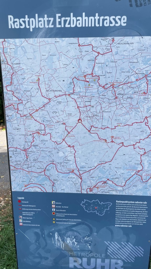 Ich bin in der Gegend der Trinkhallenkultur angekommen. Schließlich umkurve ich das alte Schiffshebewerk Henrichenburg und habe Mühe, den richtigen Track am Rhein-Herne-Kanal zu finden, der mich schließlich auf die Erzbahntrassen führen soll.