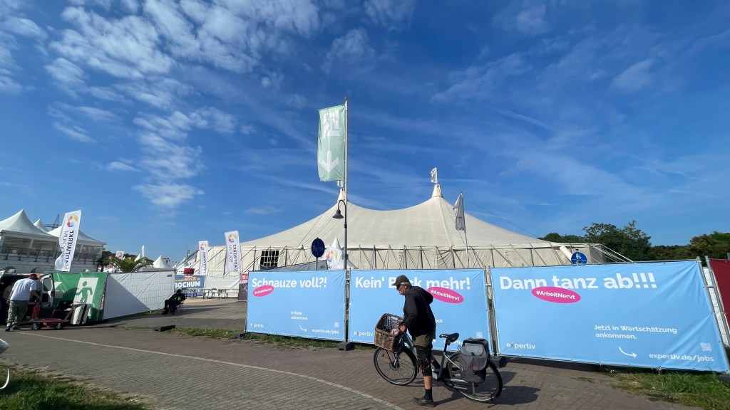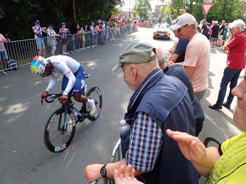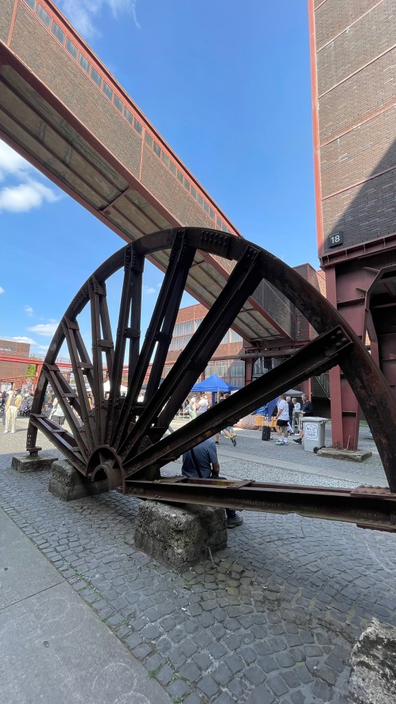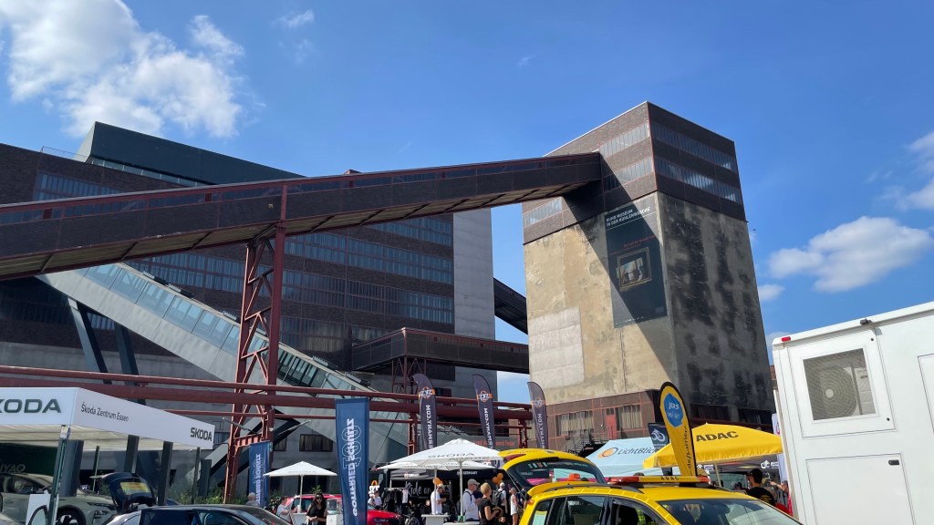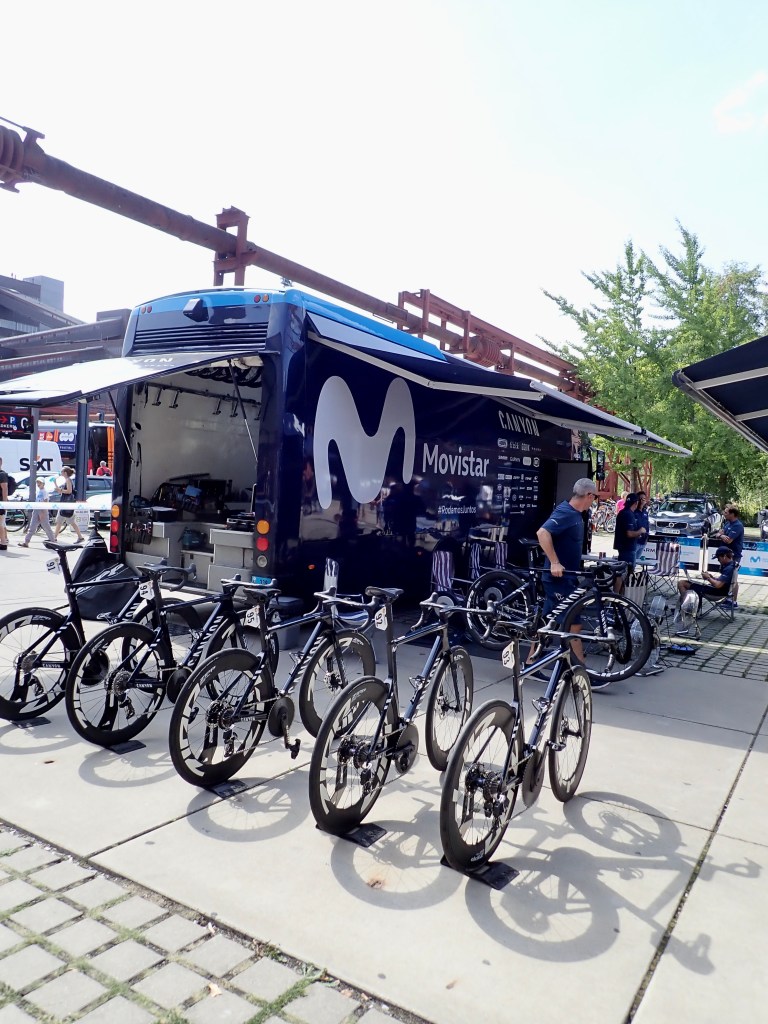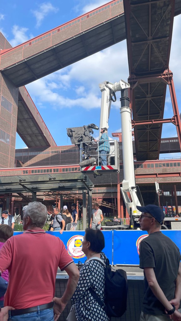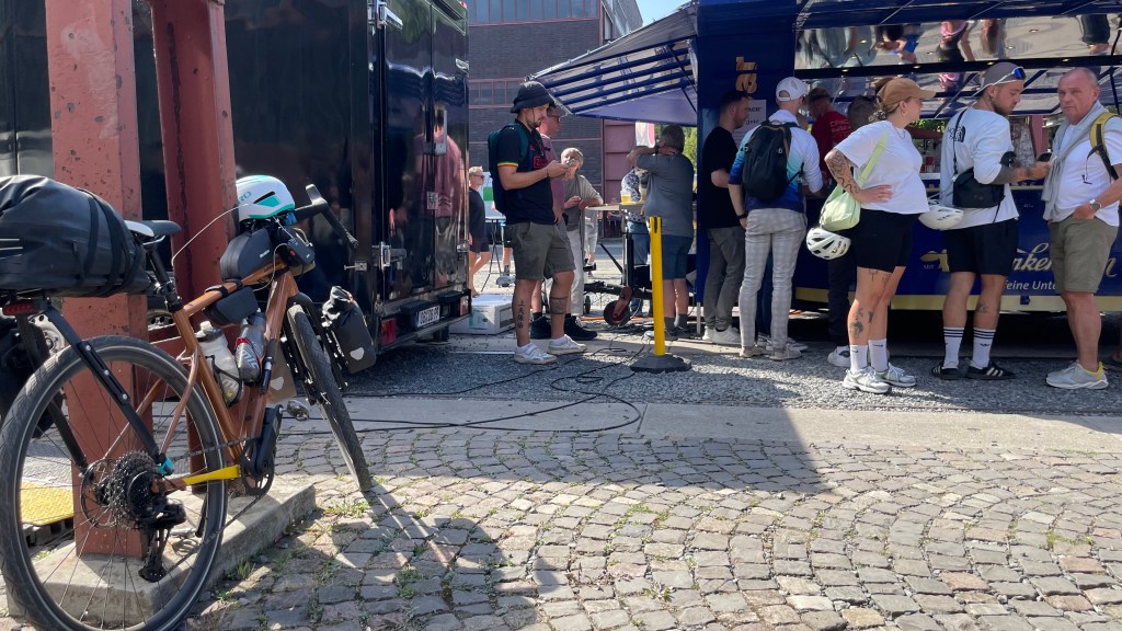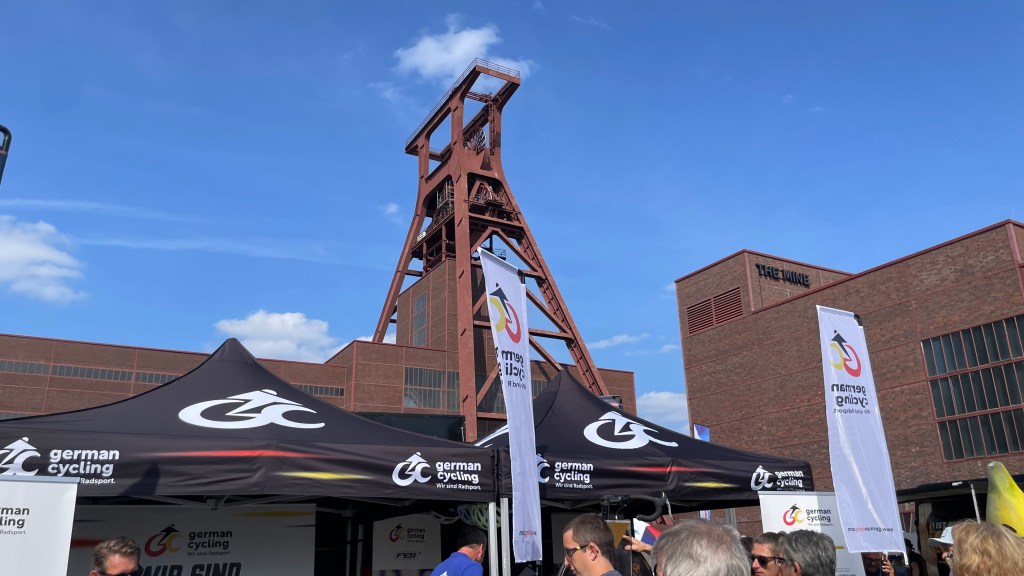 Ein Blick auf die Uhr sagt mir, dass ich langsam aufbrechen soll in Richtung Zeche Zollverein, schließlich will ich den Prolog der Radprofis erleben. 10 Kilometer weist der Radwegweiser aus bis dort. Nach reichlichen Schleifen kreuz und quer zwischen den Mannschaftsbussen und den präsentierten Rädern hindurch, lehne ich meinen Packesel an einen Stahlträger an.