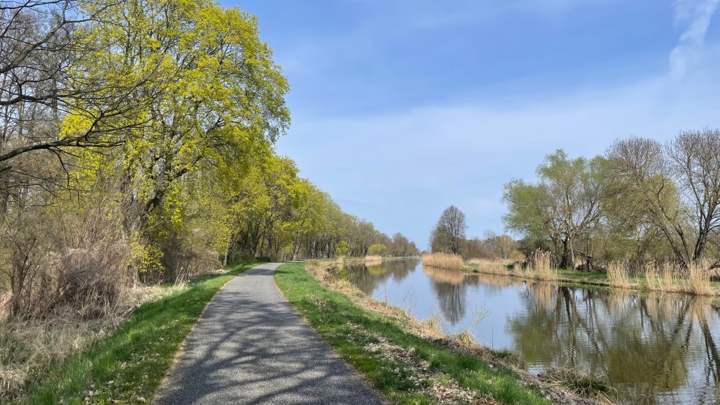 Der Voßkanal führt hin nach Zehdenick und ist gesäumt von alten Alleebäumen, die im ersten Grün erstrahlen