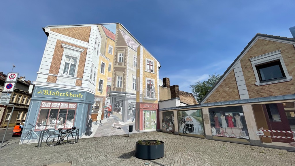 Es wird langsam Zeit, dass ich ein paar Kilometer unter die Räder bekomme. In Zehdenick bin ich bei km 50. Und schon wieder leiste ich mir einen Fotostopp: Die Wandbemalung ist es wert.