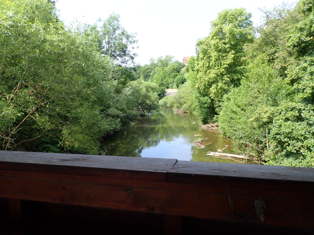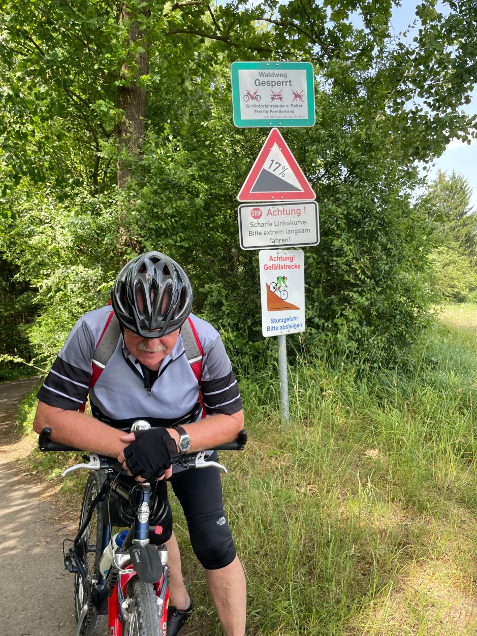 Bei der Suche der kürzesten Strecke hin zum Ursprungstrack lotse ich Matthias über einige Kilometer Plattenweg mittlerer Qualität. Als wir wieder „auf der Spur“ sind, dann die nächste Überraschung: Die Straße nach Calbe ist auch gesperrt. Weil wir nicht nochmal vorm Wasser stehen wollen, entscheiden wir uns, über Nienburg nach Staßfurt zu fahren, und werden dafür mit einer knackigen Baustellen-Pflasterpassage belohnt. Macht nichts, das härtet nur ab. Auf der Suche nach einem „Pausen-Café“ fahren wir und fahren wir und fahren wir. In Quedlinburg gönnen wir uns leicht gefrustet von der Anhaltinischen Servicewüste in einer Tanke Kaffee und Brötchen. Obwohl, das muss gesagt werden, die Altstadt von Quedlinburg überaus sehenswert und gastlich ist. Davon konnte ich mich in einem Kurzurlaub im Jahr zuvor überzeugen. Heute haben wir es eilig und lassen das historische Kleinod links ( eigentlich doch rechts) liegen. Der nächste Kontrollpunkt ist Blankenburg am Fuße des Harzes. Kilometer 221. Um kurz vor fünf arbeiten wir uns bei Heimburg in die erste Rampe hinein. Matthias lässt mich langsam davonziehen. Schön, dass ich auf meinem „Upright“ auch mal einen Vorteil genießen darf. Den Berg hinauf muss Matthias hart arbeiten. Und aus dem Sattel gehen kann er auf seinem Lieger auch nicht. Was soll´s, sagt er sich und beißt sich in den Berg hinein.