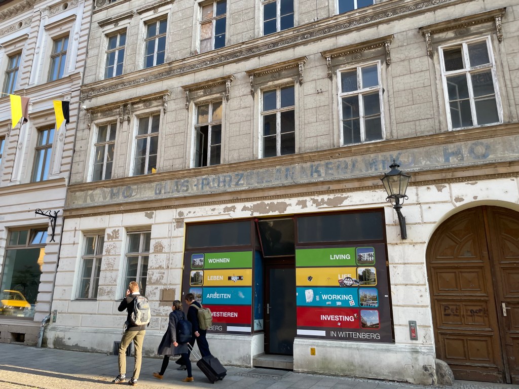 Auf der Infotafel zur Audi-Historie pappt der Werbeaufkleber einer „Cannabis Business-School“ Wir schnuppern allerdings hier keine süßen Hanf-Düfte, sondern eher miefige Industrieluft.