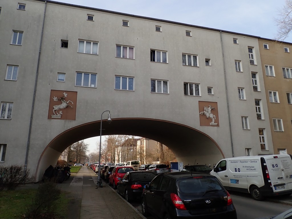 1. Februar, 10.00 Uhr. Aus dem Wolkengrau macht die Sonne Himmelblau. Das Thermometer zeigt vier Grad an, mein Cannondale Taurine ist froh, dass ich es aus dem Winterschlaf wecke. Ich habe Lust auf eine kleine Fototour mittenhinein in die große Stadt. Im Zickzack rolle ich mit der Sonne im Südosten als Wegweiser. Schnell bin ich in Afrika, genauer im Afrikanischen Viertel im Wedding, wo schon 1929 die Architekten Mebes, Emmerich und Bruno Taut die Friedrich-Ebert-Siedlung entwarfen und bauten: erschwinglicher Wohnraum, modern, zeitlos. Wohnungen mit 44 bis 62 qm Fläche und mit Zentralheizung, die über Balkon oder Loggia, dazu ein Bad verfügten. Innerhalb von nur zwei Jahren Bauzeit entstanden über 1400 Wohnungen. Auch heute, fast 100 Jahre später, wirkt die klare Formensprache modern und zeitgemäß.