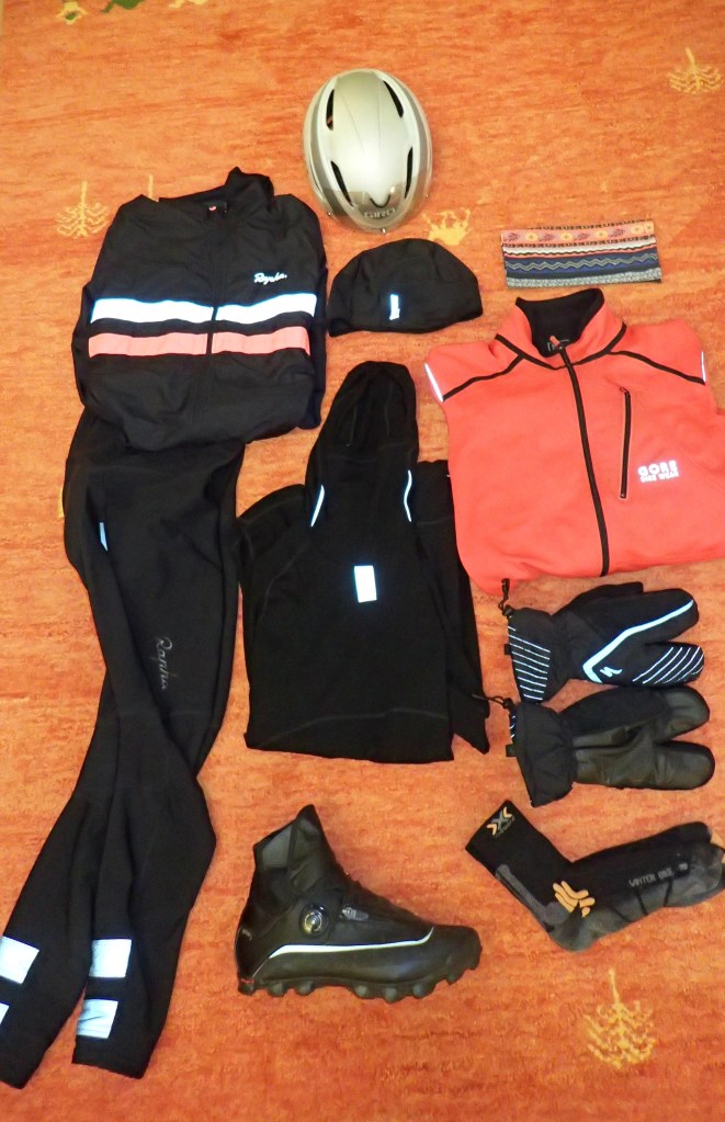 Die Hände bleiben auch bei Minusgraden in Lobster-Handschuhen warm. Beine und Rumpf und was da sonst noch dranhängt, halte ich funktionsfähig mit einer Rapha Winter Bib – schweineteuer, aber haltbar und warm und auch mit Reflexstreifen ausgerüstet.