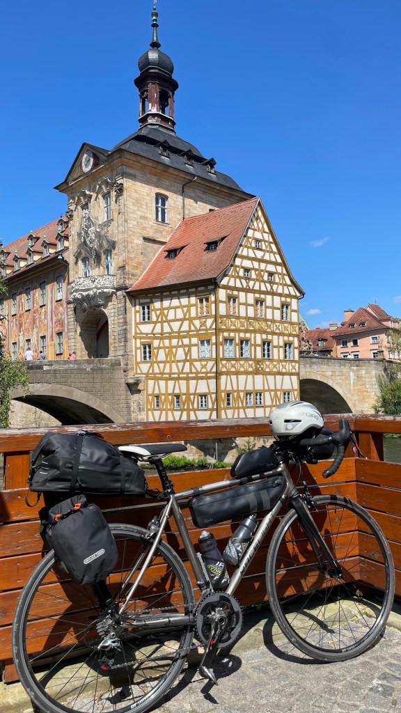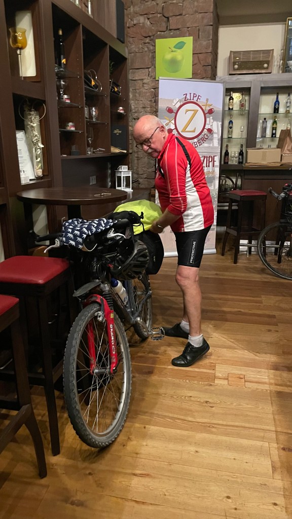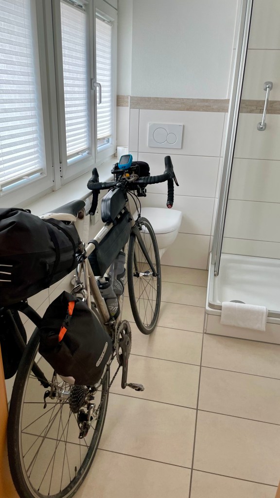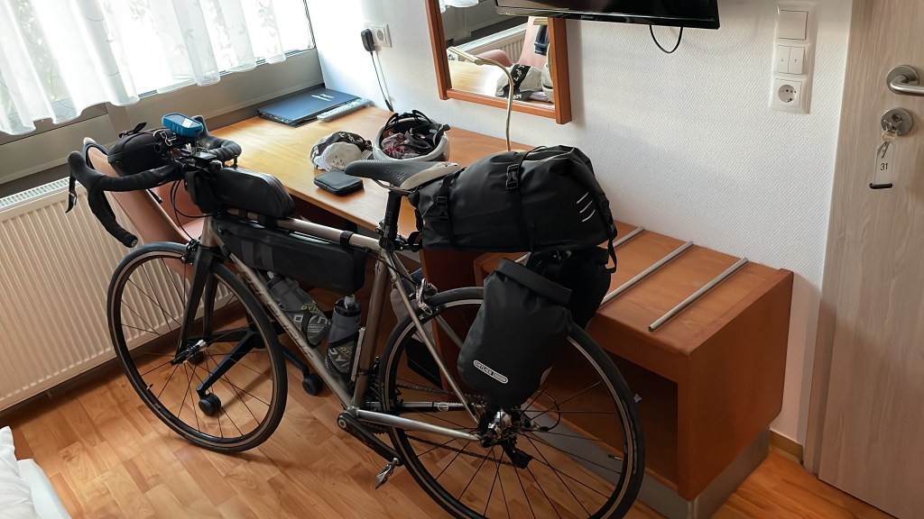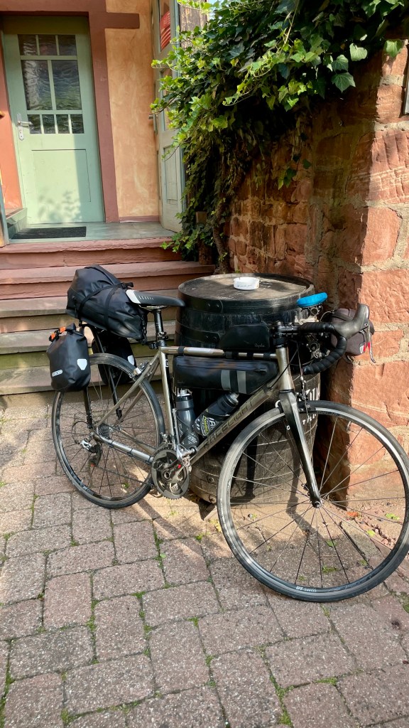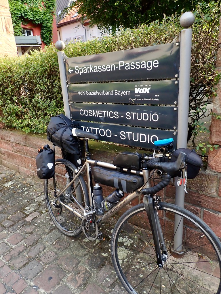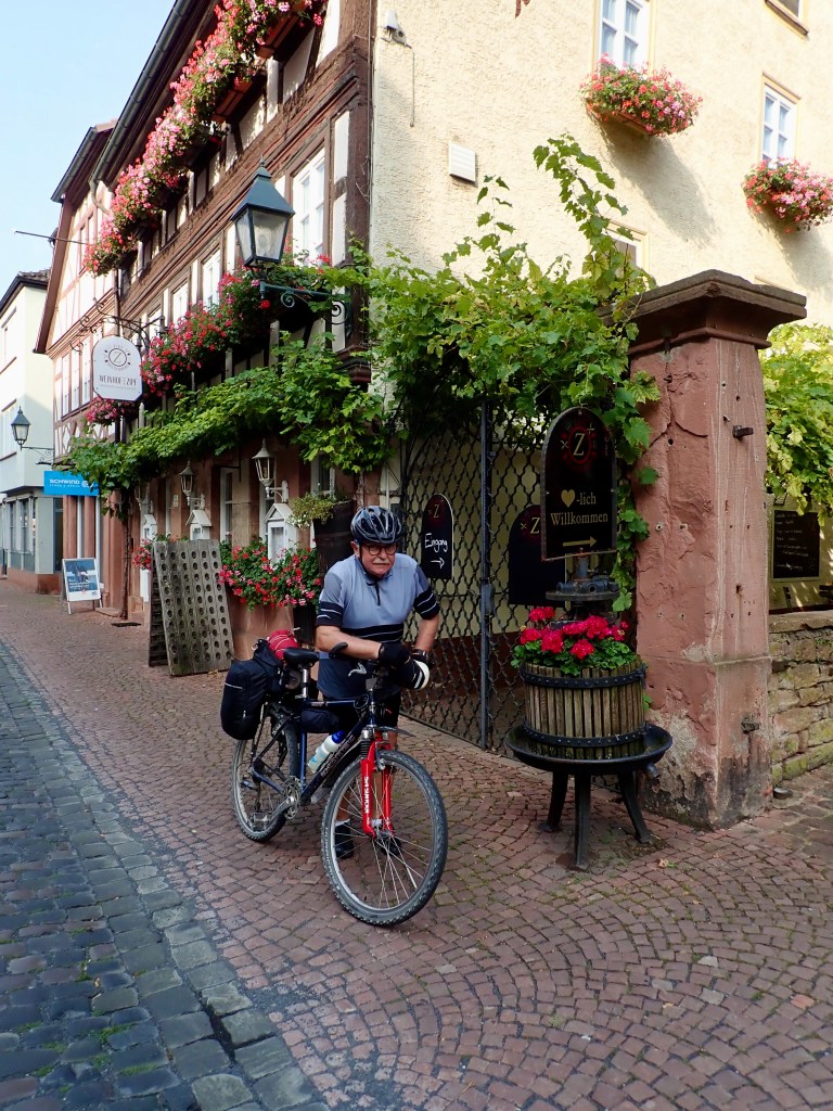 In Weinheim wähnen wir uns kurz im nahen oder ferneren Osten. Eine Moschee steht mitten in einem Gewerbegebiet. Dann machen wir einfach stoisch Kilometer. Auch in Weinheim können wir kaum Weinreben entdecken. Die Bundesstraße 3 ist gesäumt von wenig attraktiven Gewerbeansiedlungen. Für uns Radler jedenfalls ist das eher langweilig hier. Und den Umweg hinein in die Hänge und Dörfer des Odenwaldes sparen wir uns. Wir sind schließlich auf unserer Schlussetappe. Sulzbach, Laudenbach, Hemsbach, schließlich Bensheim, wo wir auf die Suche nach einem Nachtquartier gehen. Gefühlt jeder dritte Laden ist hier ein Friseursalon. „Josefine, Friseur relax, Ästhetik Beauty, Haargold, Kajaks Hair, Hatice´s hairstyle … “ Aber wir suchen doch nur ein kleines Hotel. Dann wählen wir für unsere letzte Übernachtung das Parkhotel Krone. Schönes Zimmer, prächtige Fahrradgarage. Aber dann auch für uns Gäste kein Platz mehr auf der Restaurantterrasse. „Bin nur allein und kann nicht mehr Tische bedienen“, redet sich der unwillige junge Mann heraus. Wir sind stocksauer und gehen auf die Suche nach einer Alternative. Star Döner, Kebap Haus, Meat Heaven, Rhodos … Und im einzigen Biergarten, der gut aussieht, feiern junge Damen einen Junggesellinnenabschied. Alle Plätze sind besetzt. Langsam macht sich Frust bei uns breit. Die Erlösung finden wir dann im Angebot eines Lidl-Marktes, wo wir uns mit Bier, Wein, Würstchen und Chips eindecken. Für ein wahrhaft frugales Mahl auf dem Hotelzimmer. Wir lassen die Erlebnisse der Woche Revue passieren, schwelgen in unseren Eindrücken, sind zufrieden mit uns und der Welt. Der Schlummer ist gut und die letzten 28 Kilometer hin zum Darmstädter Bahnhof gelingen locker.