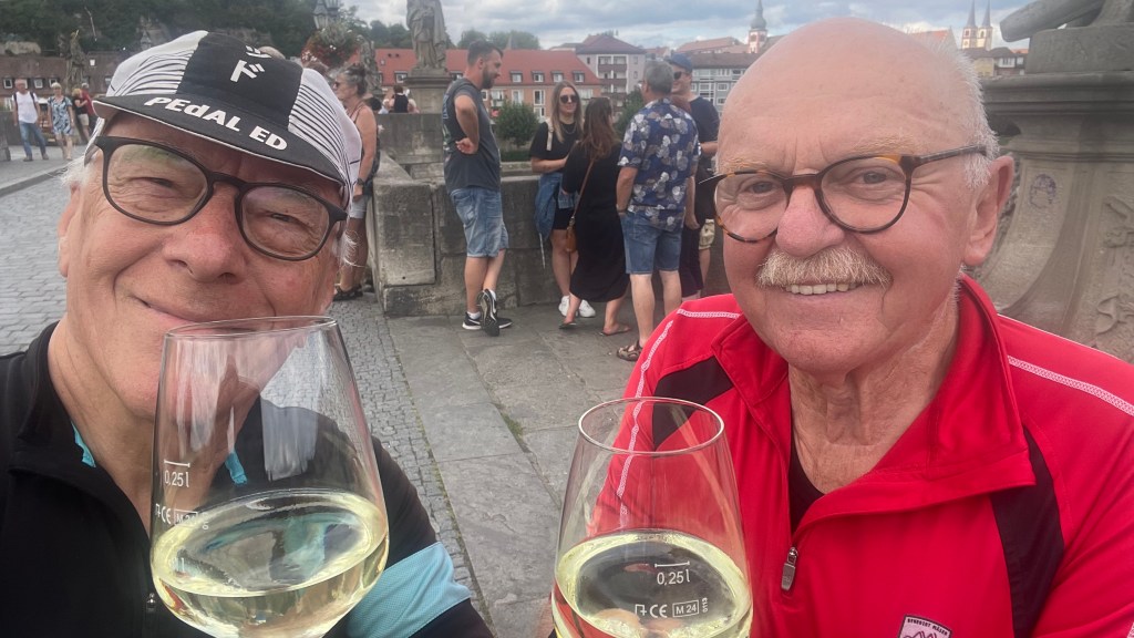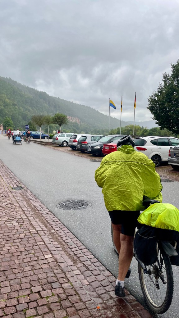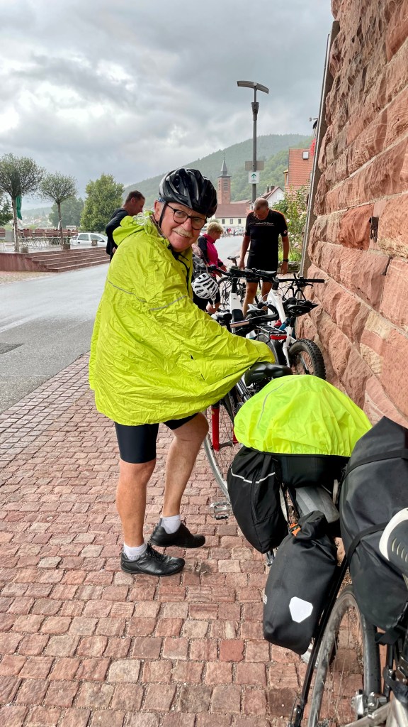 Die ersten 1o Kilometer in Richtung Heilbronn führen hinauf in die Weinhänge. Ein Weinberg ist auch ein Berg, bemerkt Peter schwitzend. Und nach dem Hinaufkurbeln folgt bekanntlich immer eine schöne Abfahrt. Und der Peter traut sich jetzt auch, die Bremsen mal offen zu lassen.